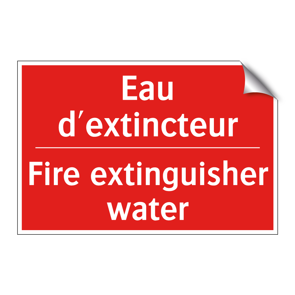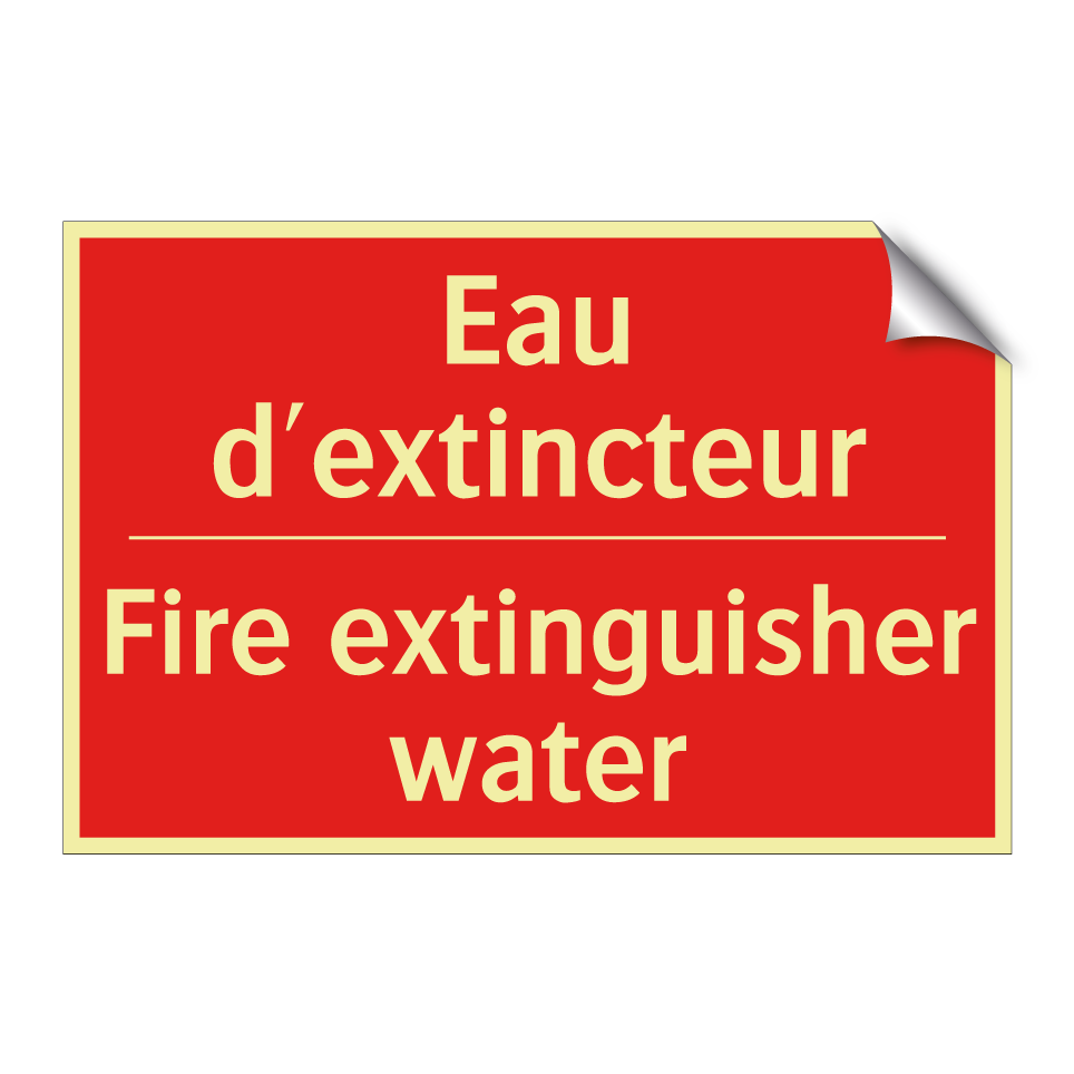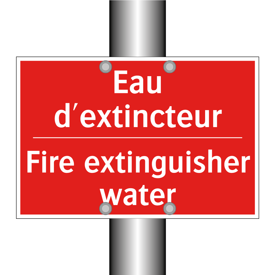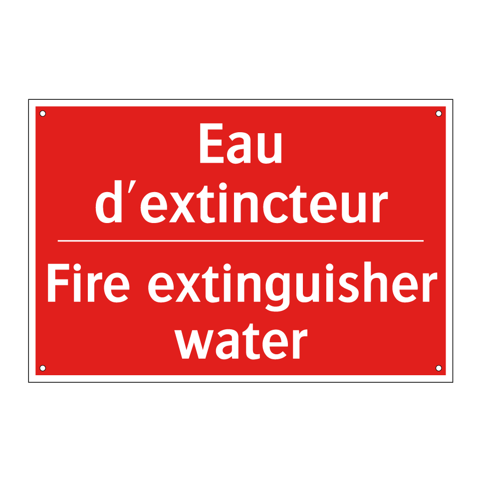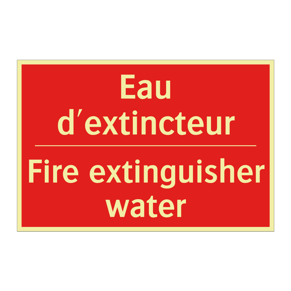 Panneau de signalisation incendie bilingue avec texte en français : "Eau d'extincteur", et en anglais : "Fire extinguisher water"
