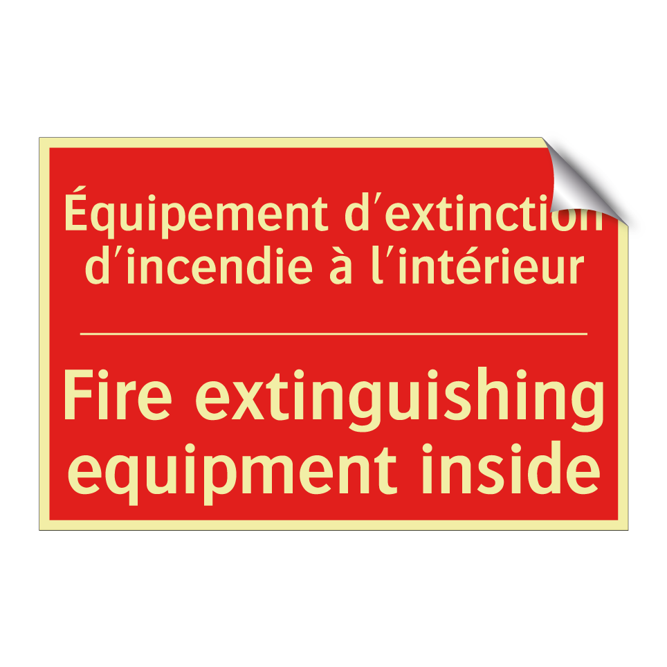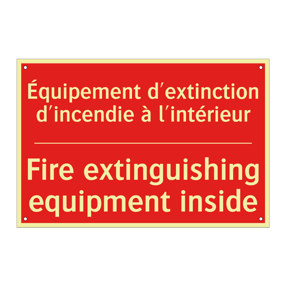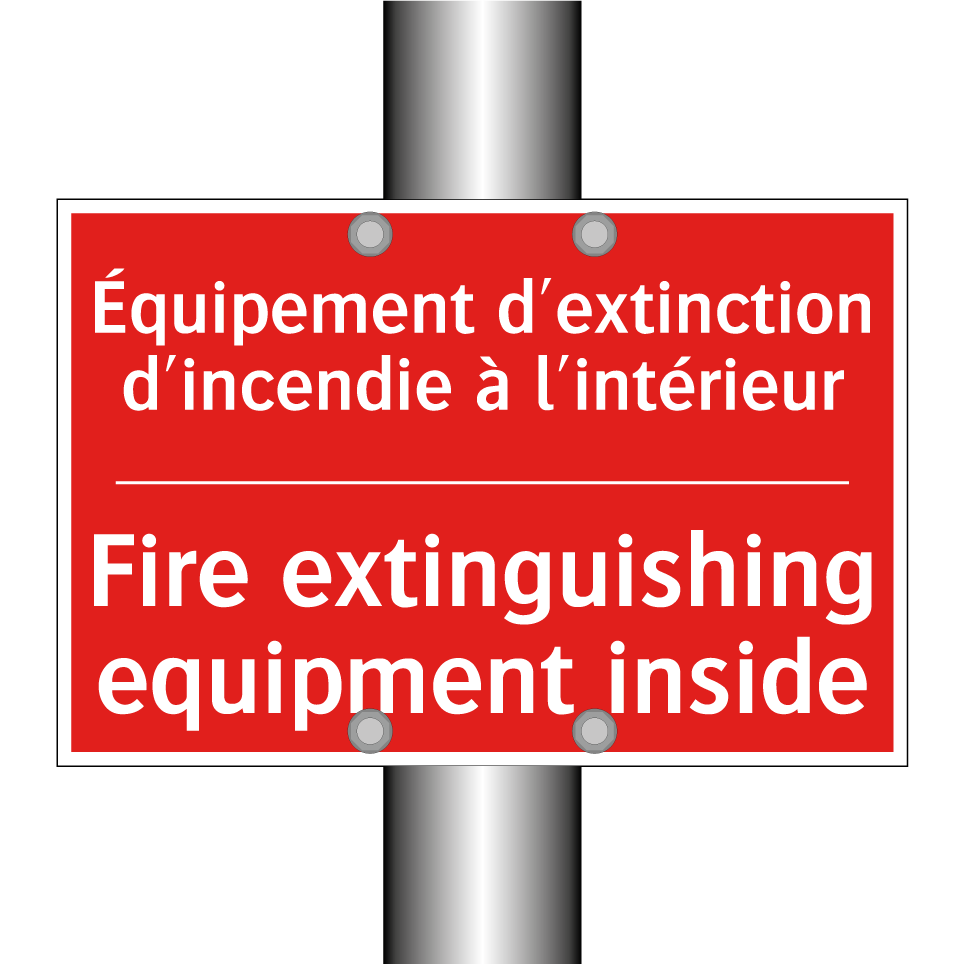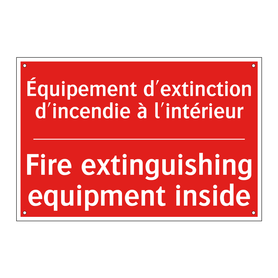 Panneau de signalisation incendie bilingue avec texte en français : "Équipement d'extinction d'incendie à l'intérieur", et en anglais : "Fire extinguishing equipment inside"