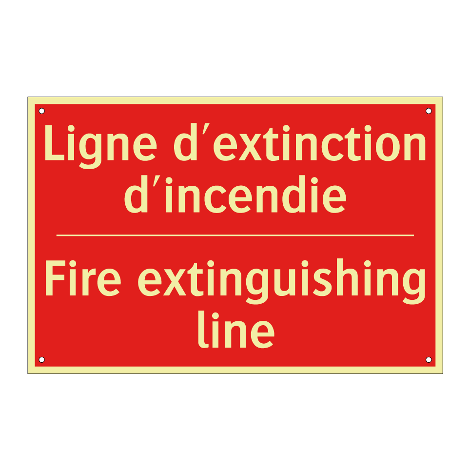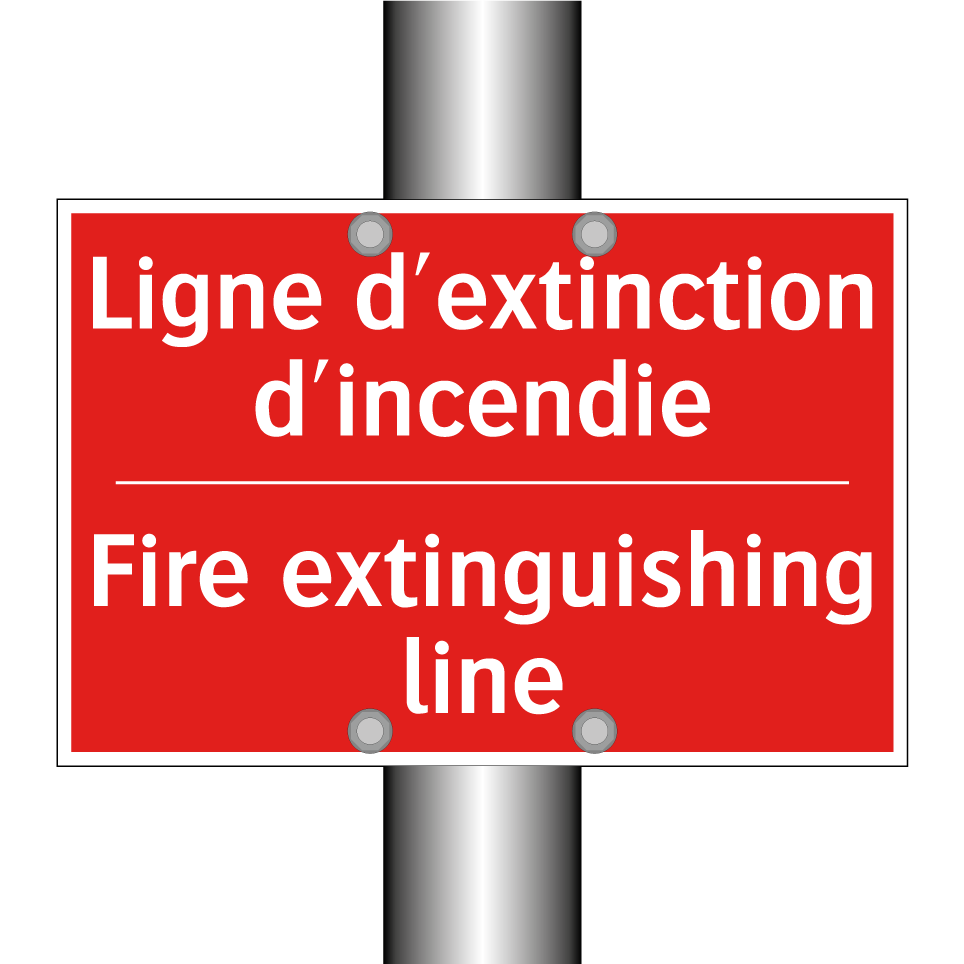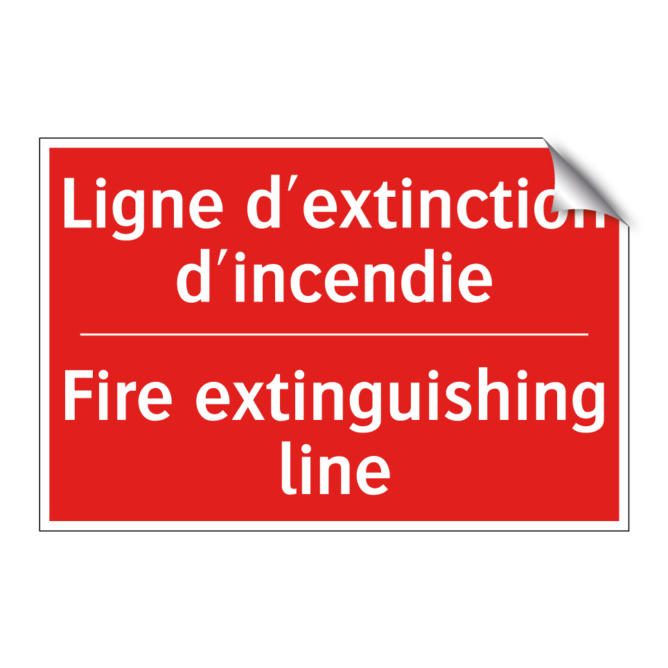 Panneau de signalisation incendie bilingue avec texte en français : "Ligne d'extinction d'incendie", et en anglais : "Fire extinguishing line"
