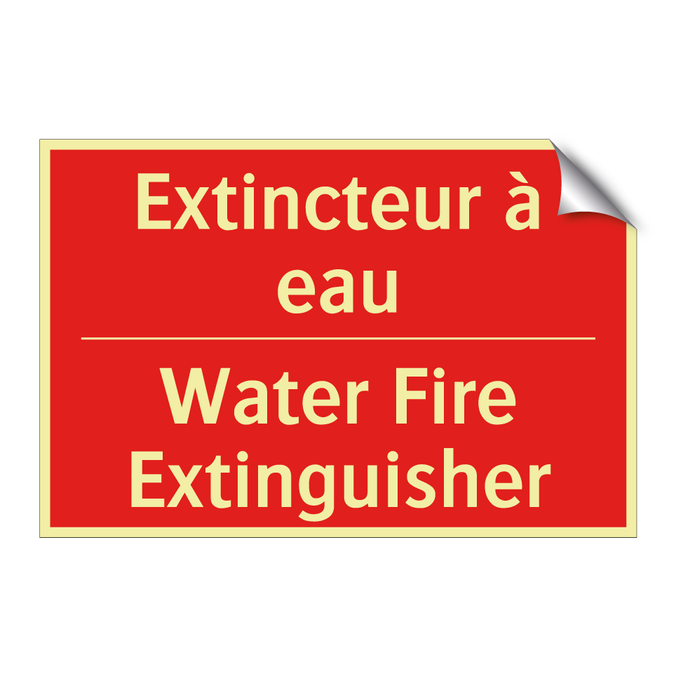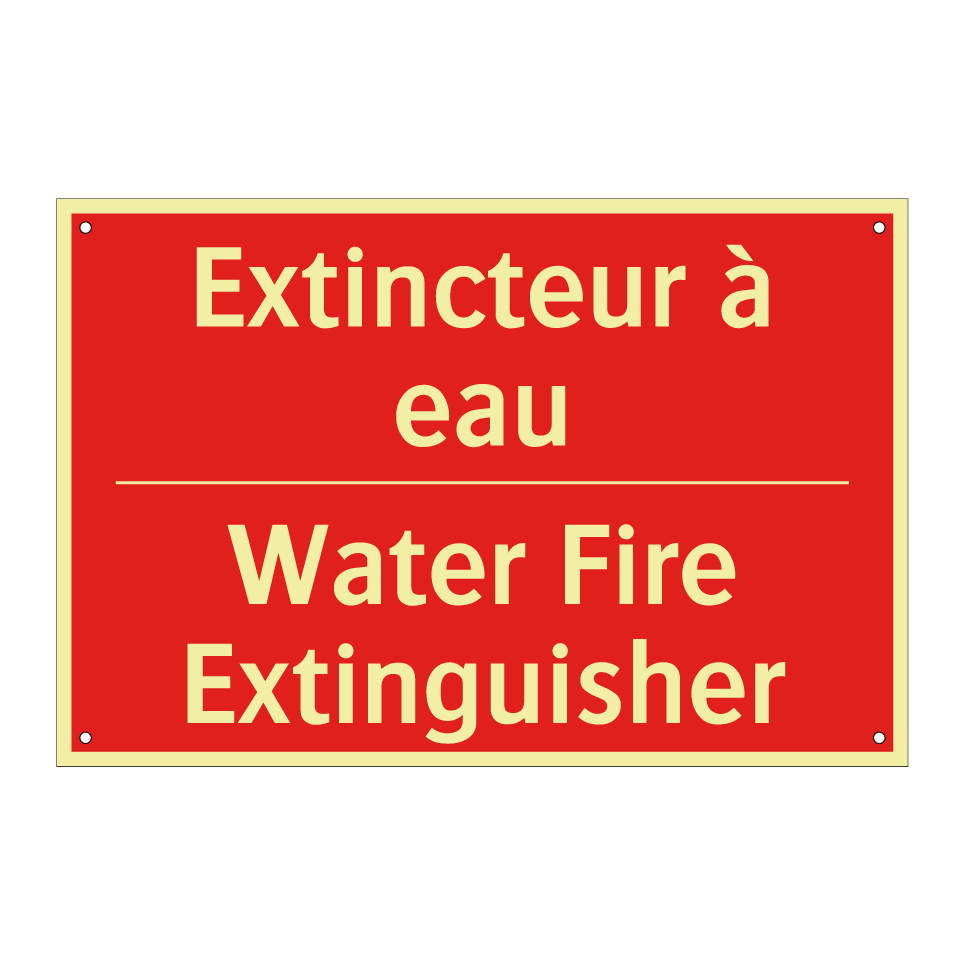 Panneau de signalisation incendie bilingue avec texte en français : "Extincteur à eau", et en anglais : "Water Fire Extinguisher"