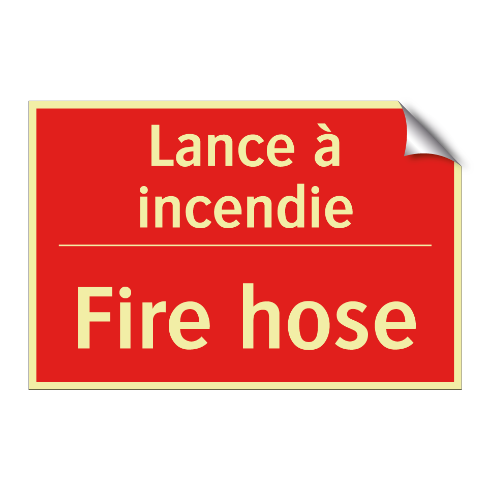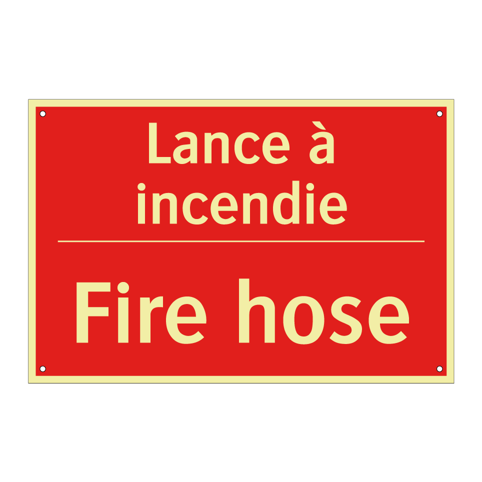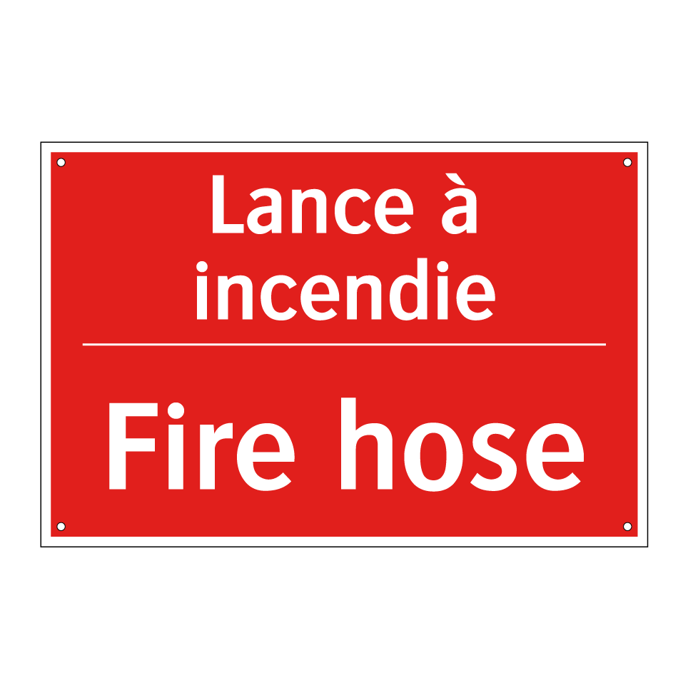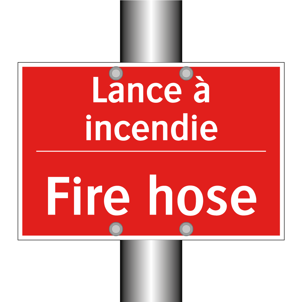 Panneau de signalisation incendie bilingue avec texte en français : "Lance à incendie", et en anglais : "Fire hose"