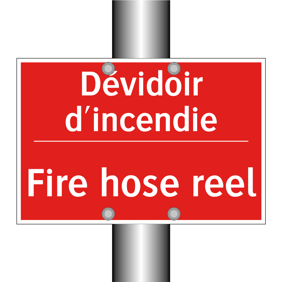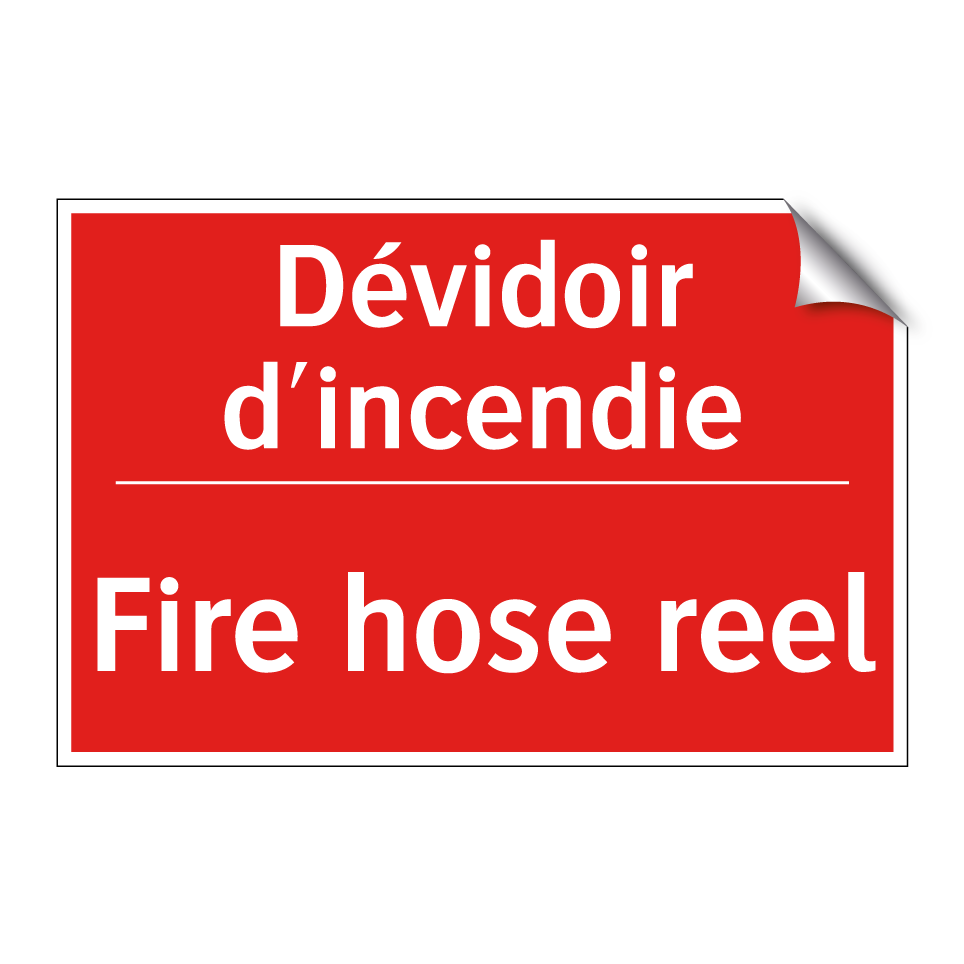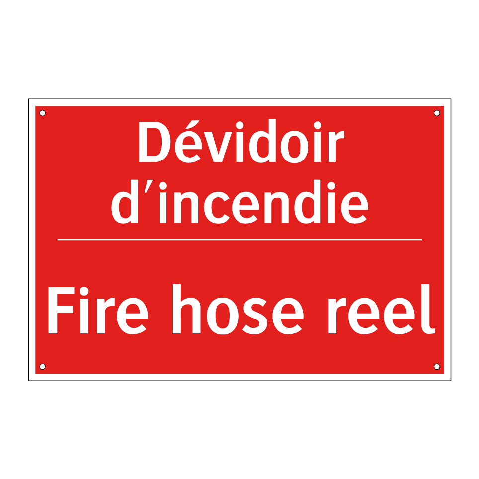 Panneau de signalisation incendie bilingue avec texte en français : "Dévidoir d'incendie", et en anglais : "Fire hose reel"