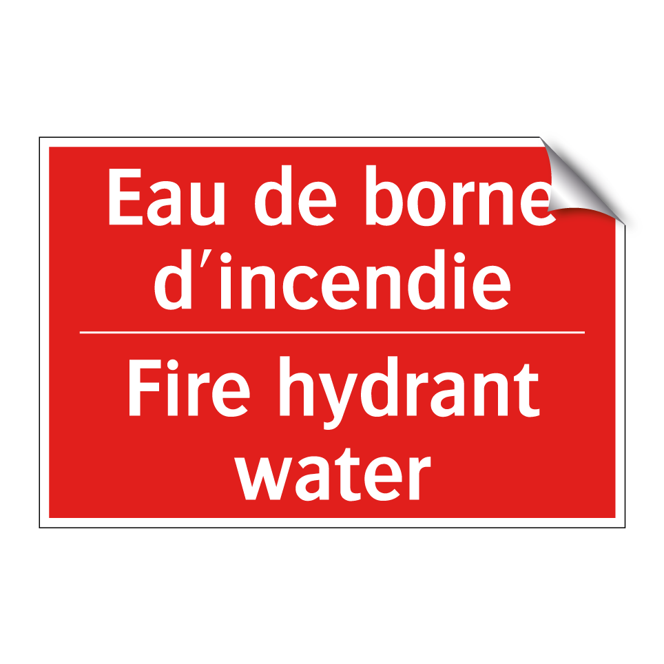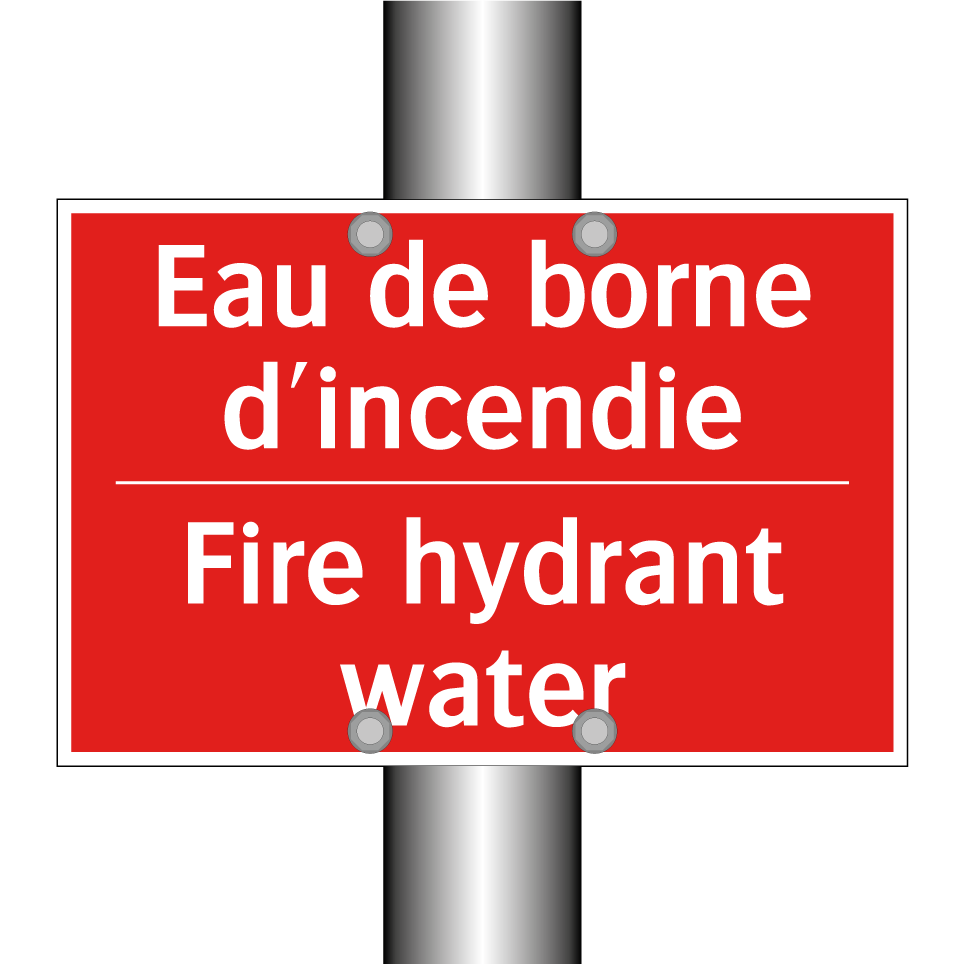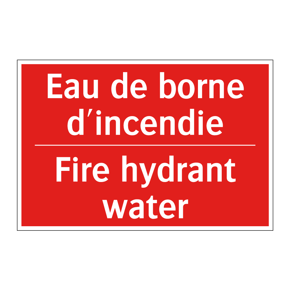Panneau de signalisation incendie bilingue avec texte en français : "Eau de borne d'incendie", et en anglais : "Fire hydrant water"