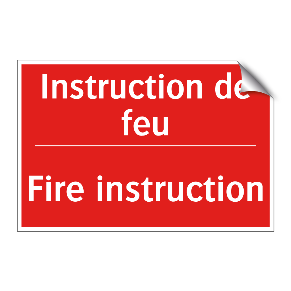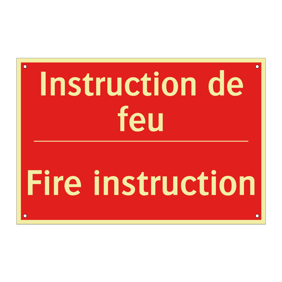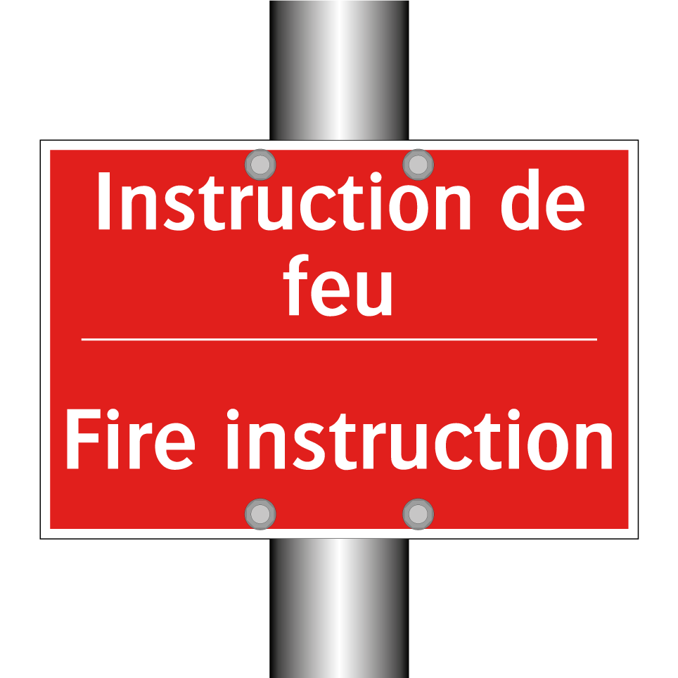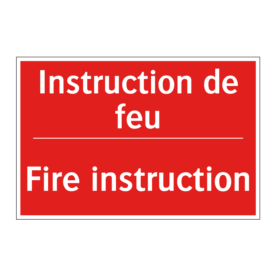 Panneau de signalisation incendie bilingue avec texte en français : "Instruction de feu", et en anglais : "Fire instruction"