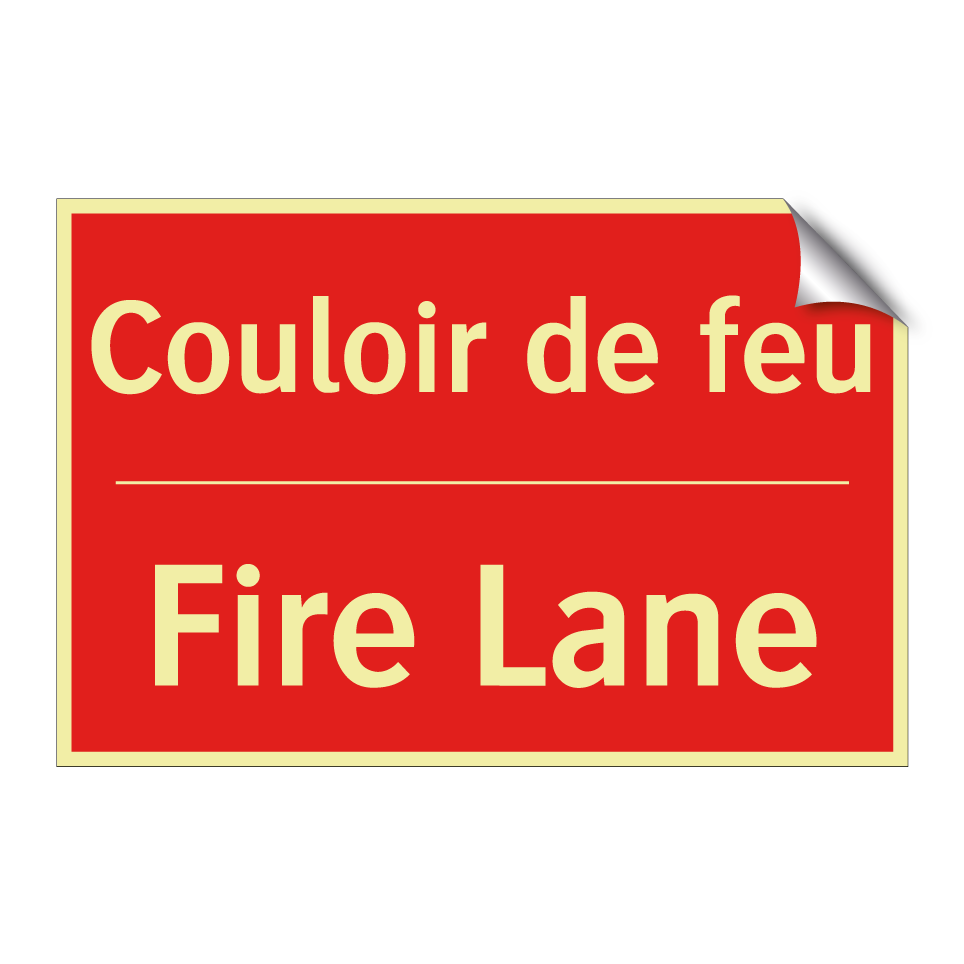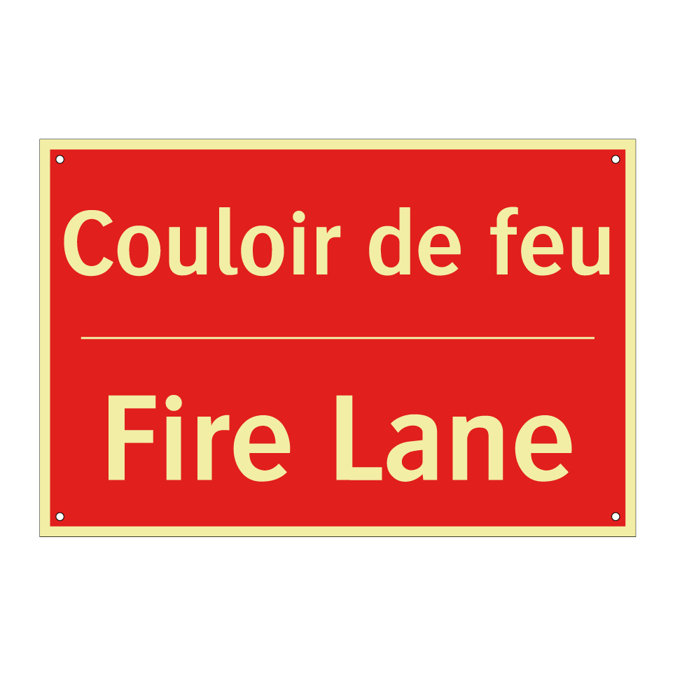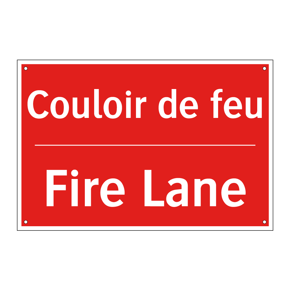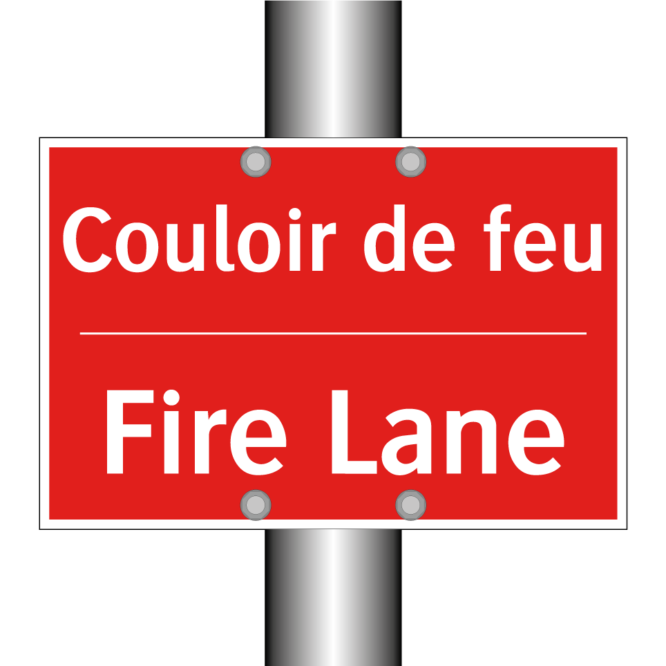 Panneau de signalisation incendie bilingue avec texte en français : "Couloir de feu", et en anglais : "Fire Lane"