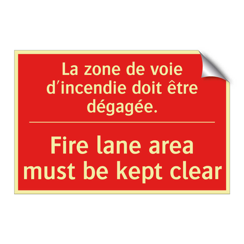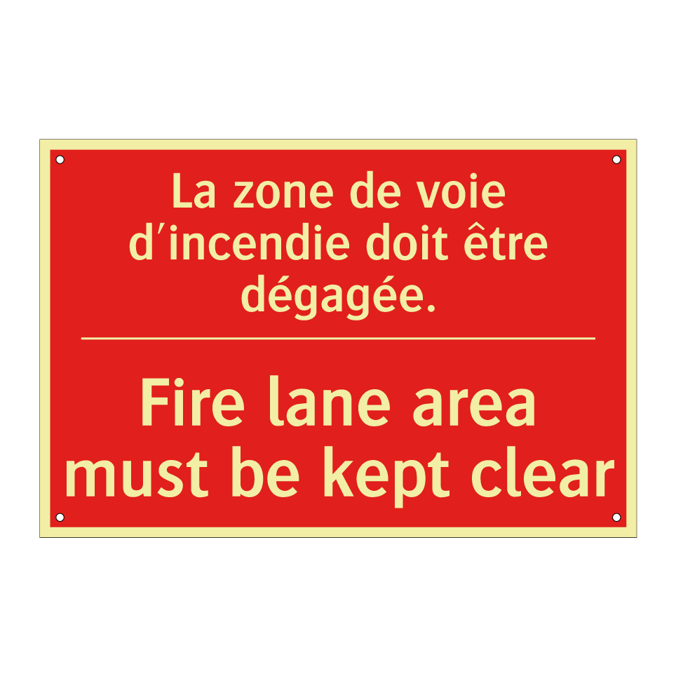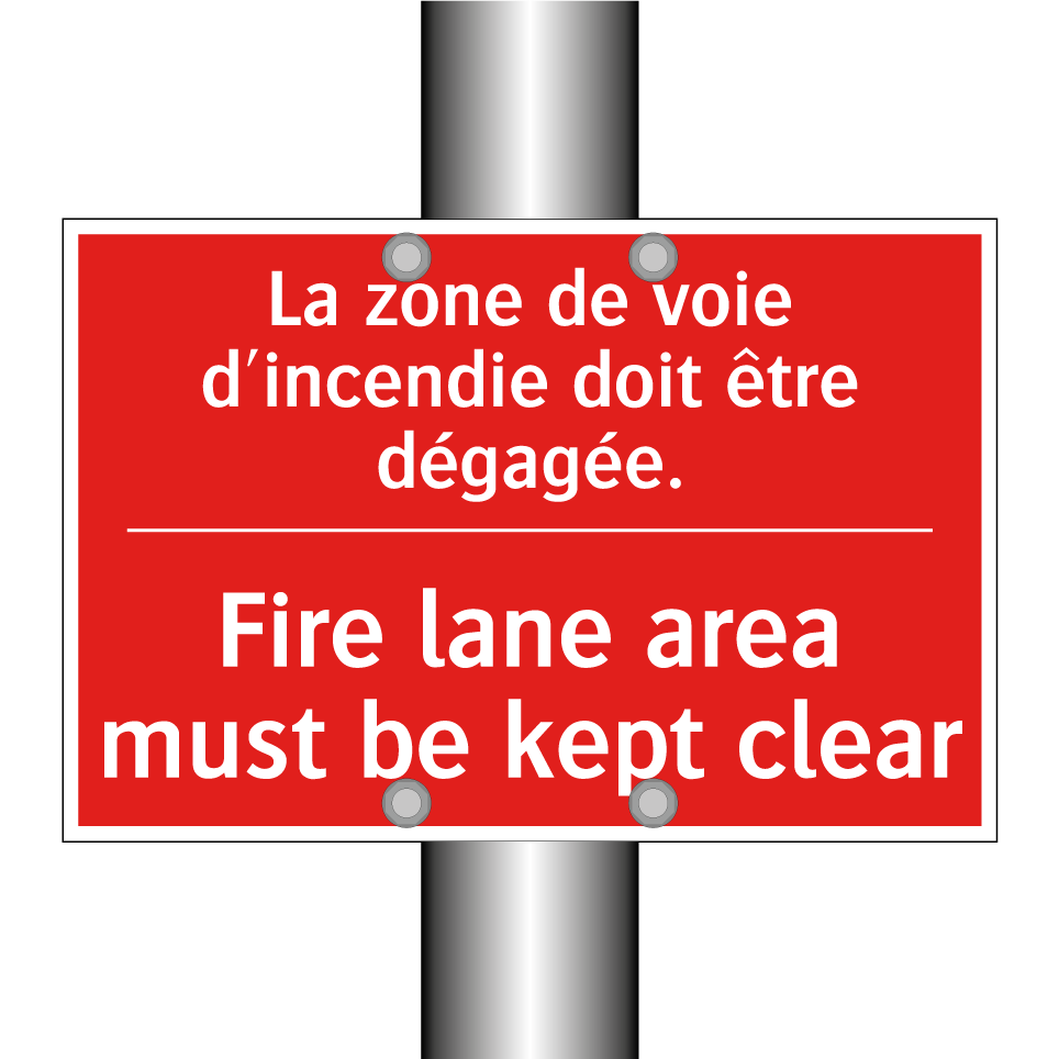 Panneau de signalisation incendie bilingue avec texte en français : "La zone de voie d'incendie doit être dégagée.", et en anglais : "Fire lane area must be kept clear"