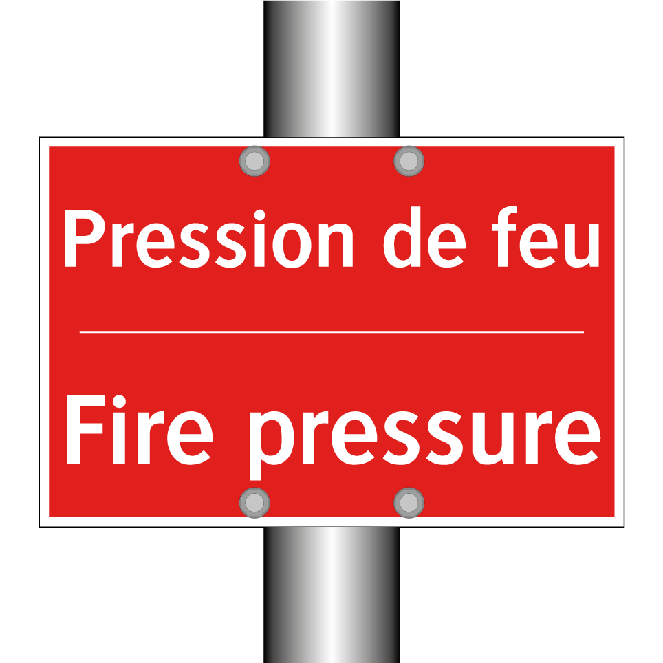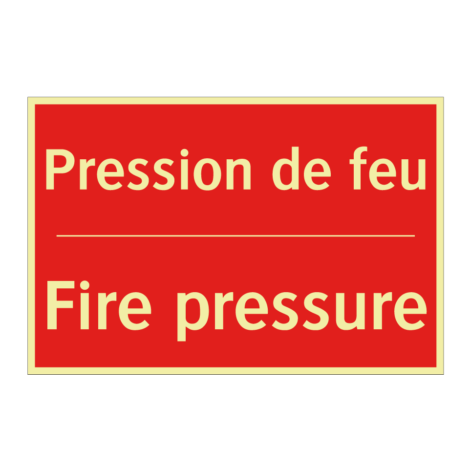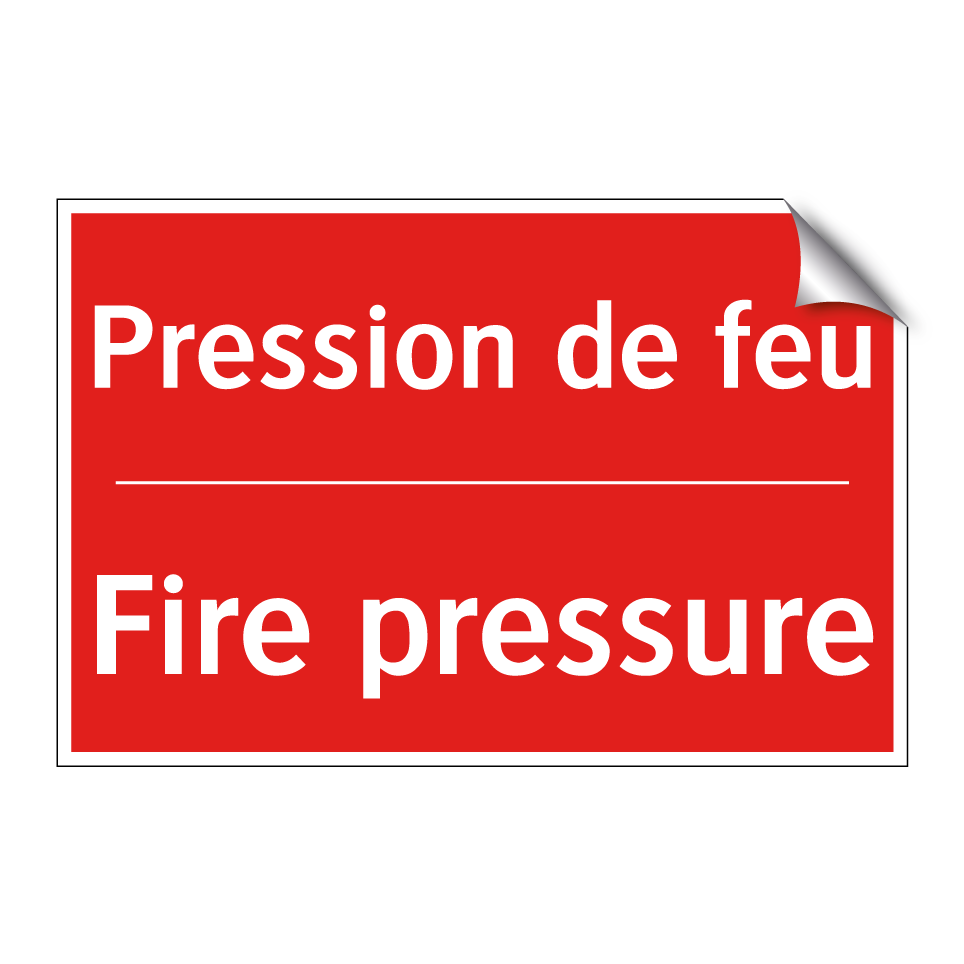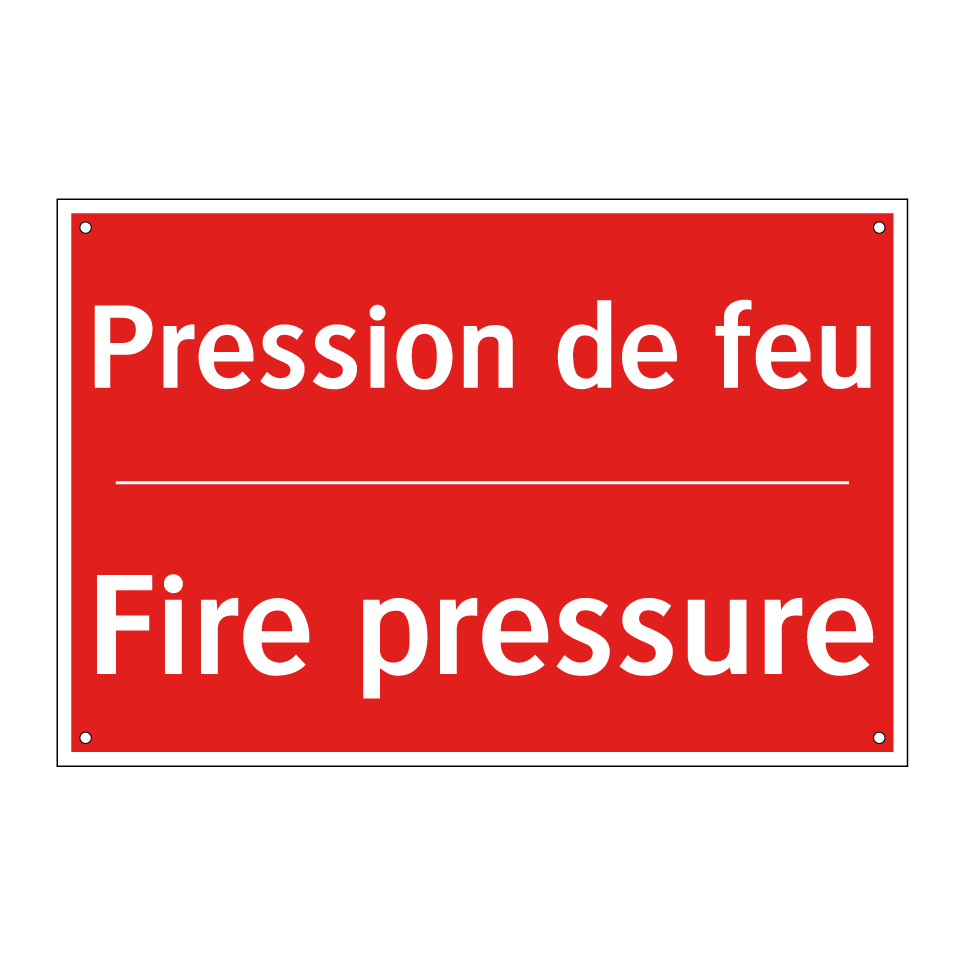 Panneau de signalisation incendie bilingue avec texte en français : "Pression de feu", et en anglais : "Fire pressure"
