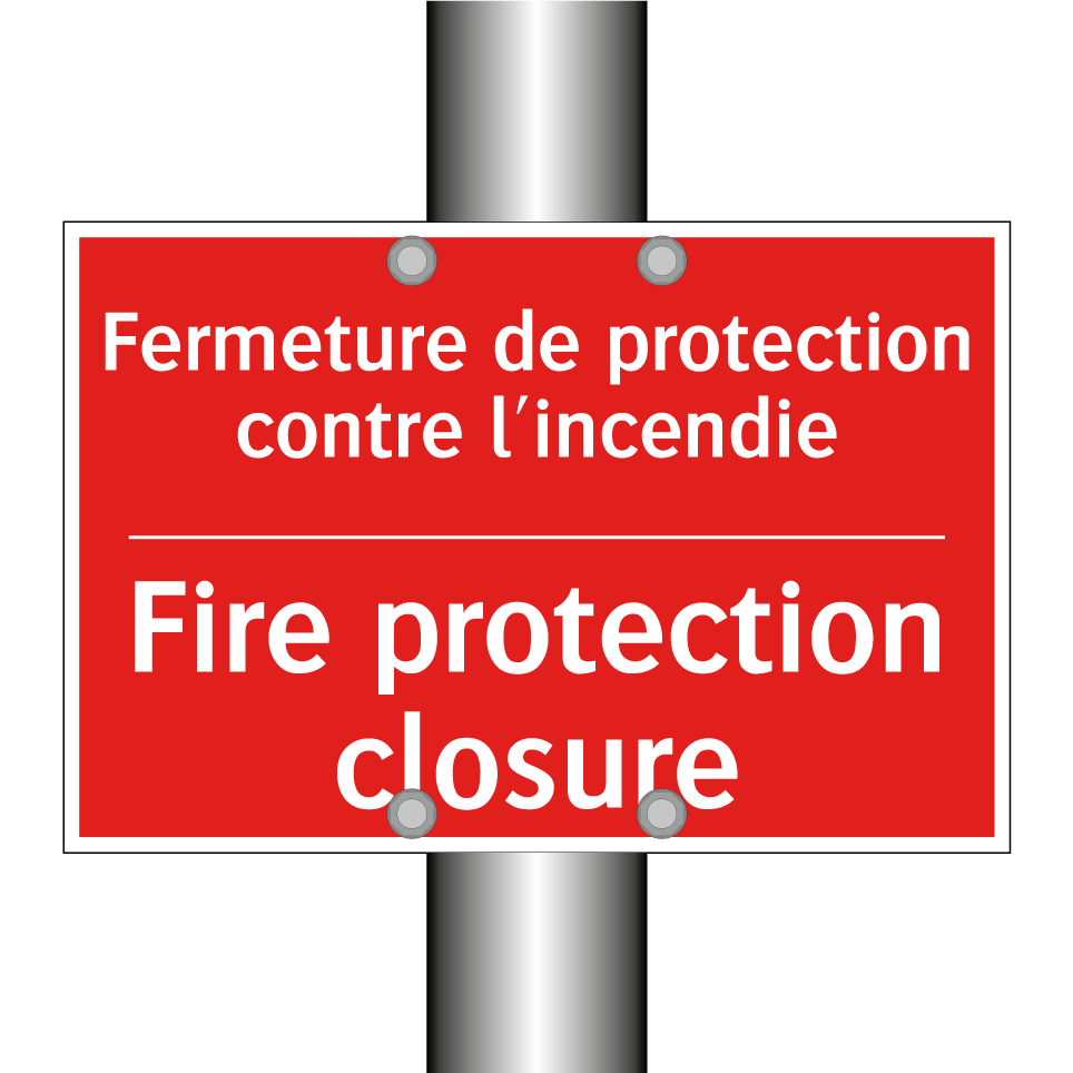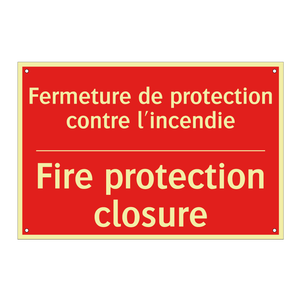 Panneau de signalisation incendie bilingue avec texte en français : "Fermeture de protection contre l'incendie", et en anglais : "Fire protection closure"