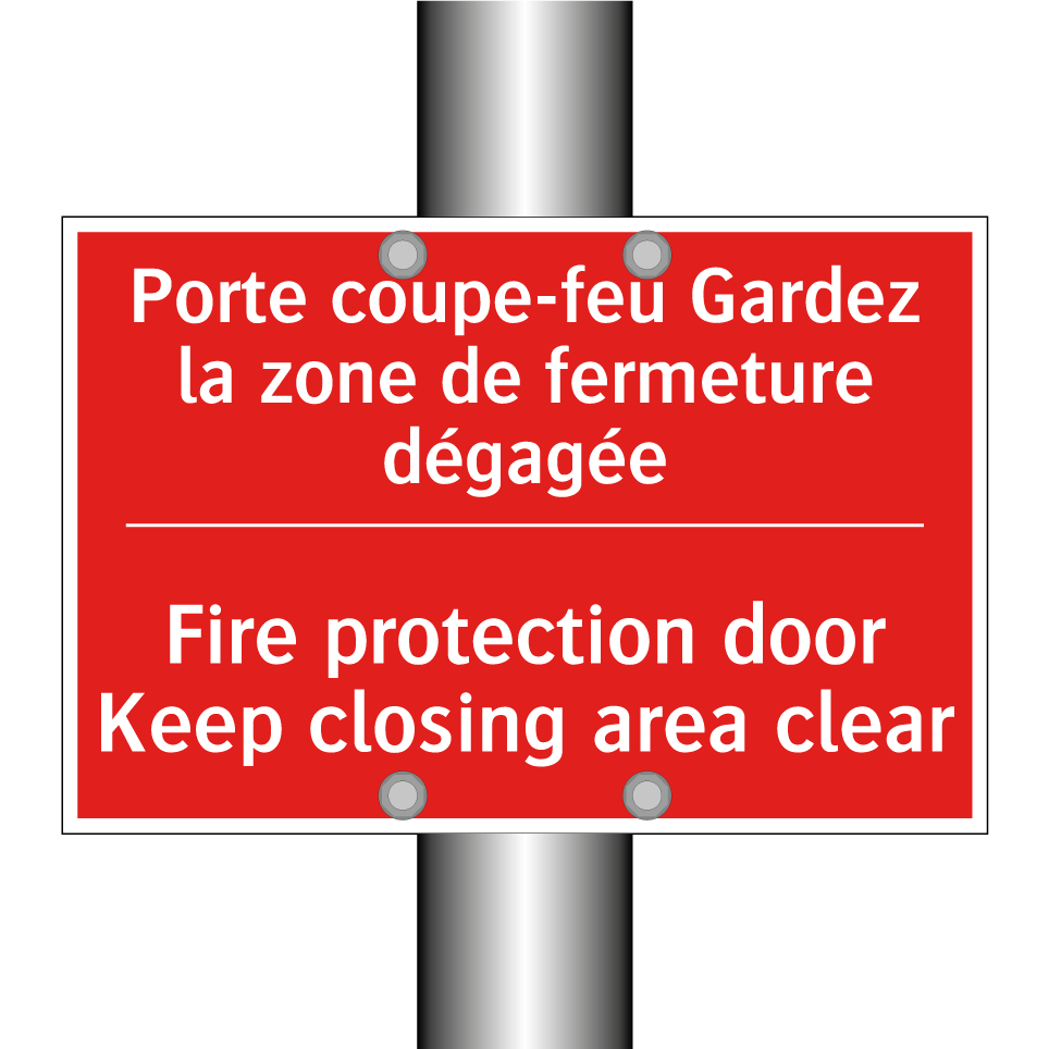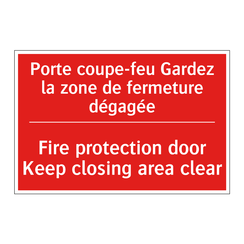 Panneau de signalisation incendie bilingue avec texte en français : "Porte coupe-feu Gardez la zone de fermeture dégagée", et en anglais : "Fire protection door Keep closing area clear"