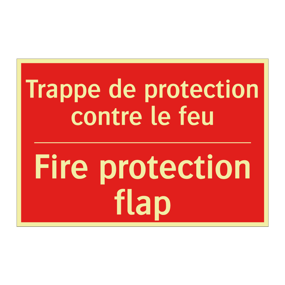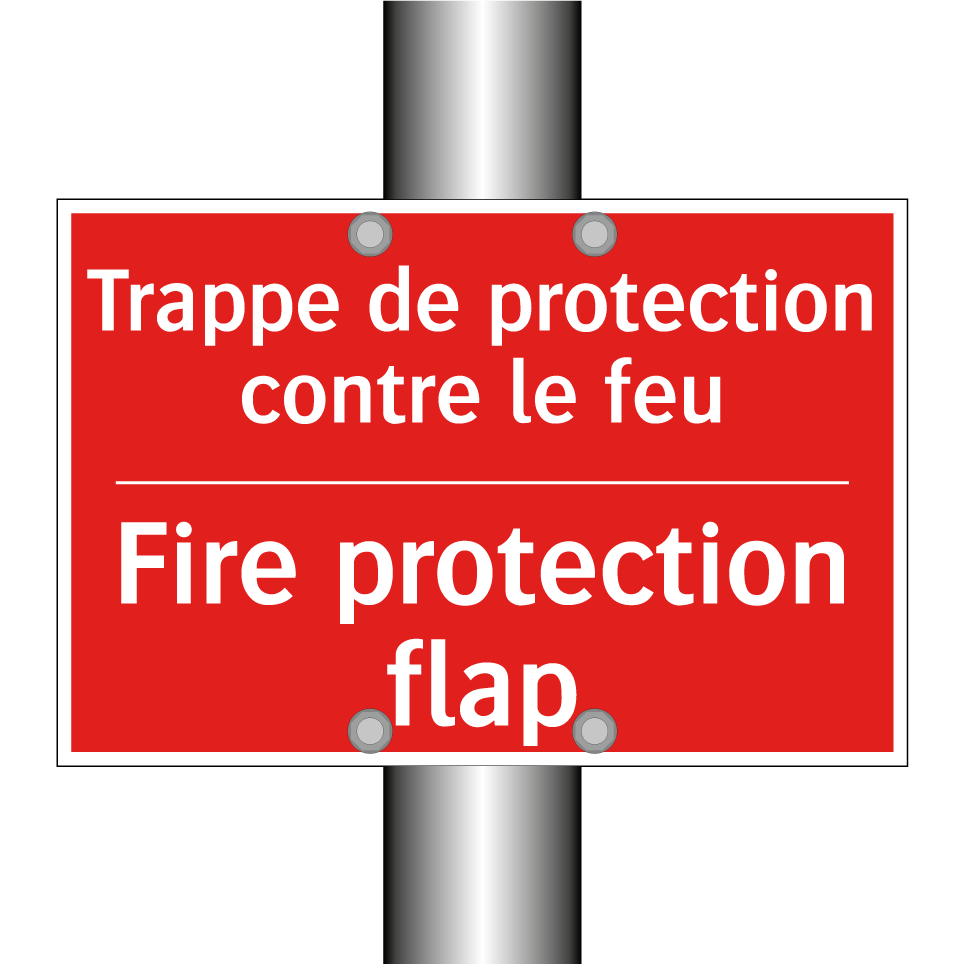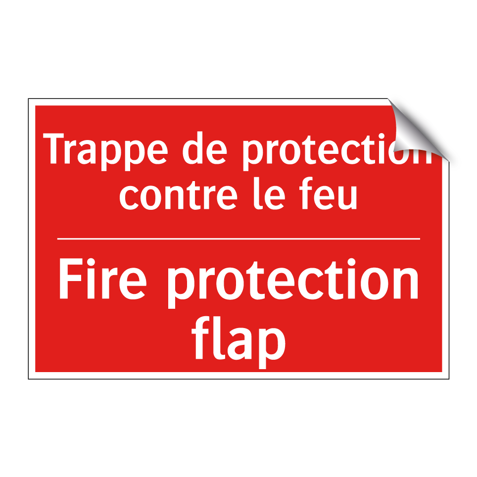 Panneau de signalisation incendie bilingue avec texte en français : "Trappe de protection contre le feu", et en anglais : "Fire protection flap"