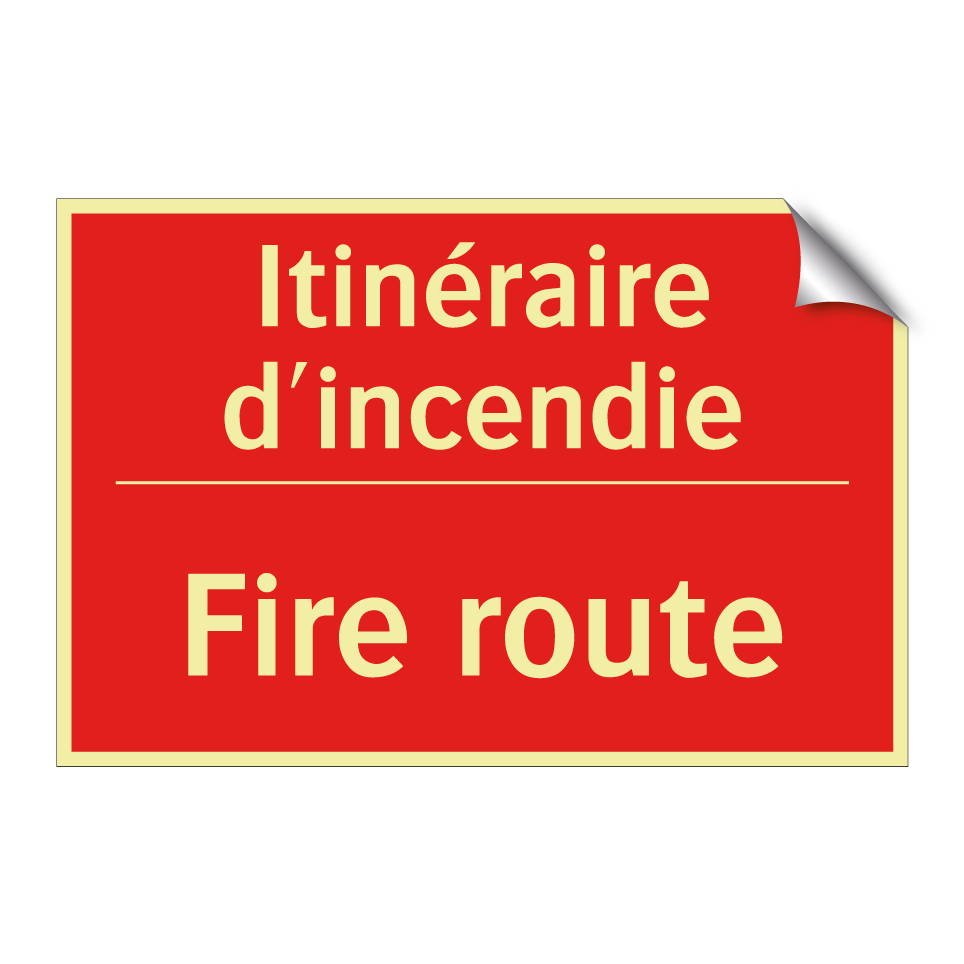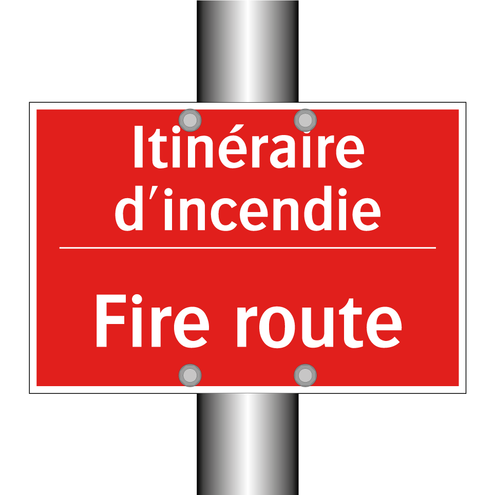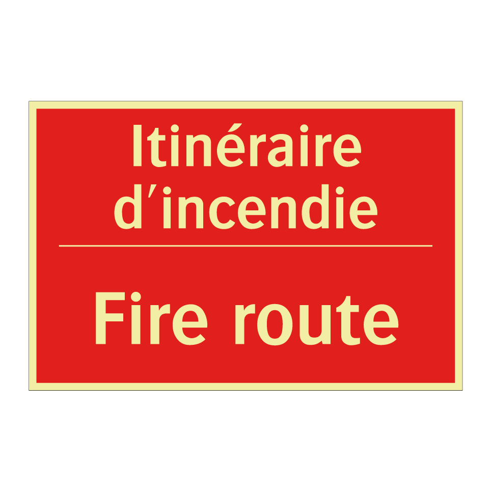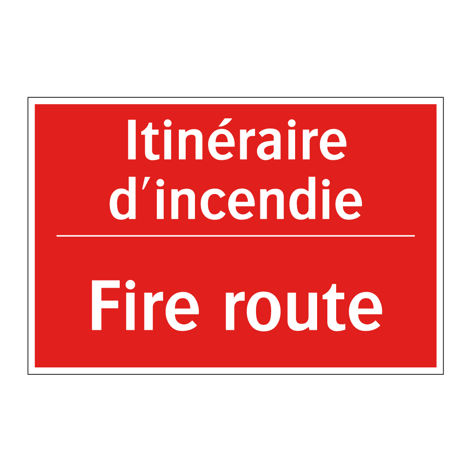 Panneau de signalisation incendie bilingue avec texte en français : "Itinéraire d'incendie", et en anglais : "Fire route"