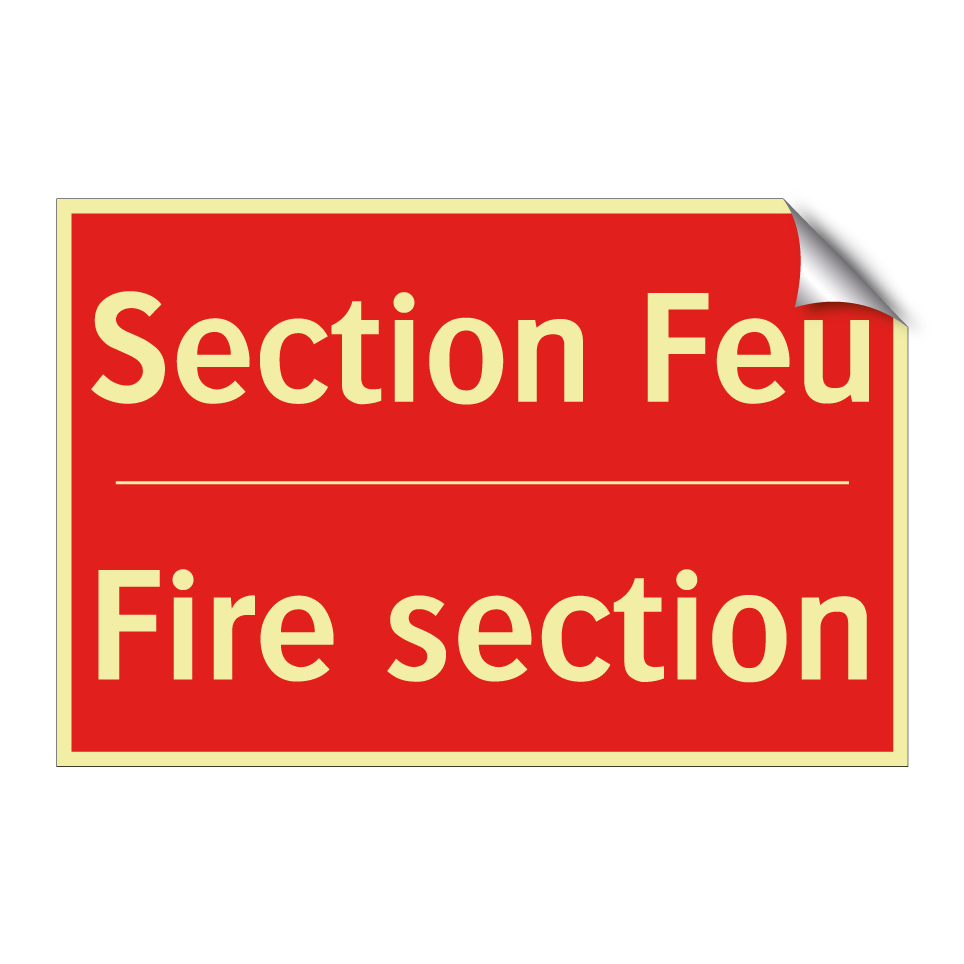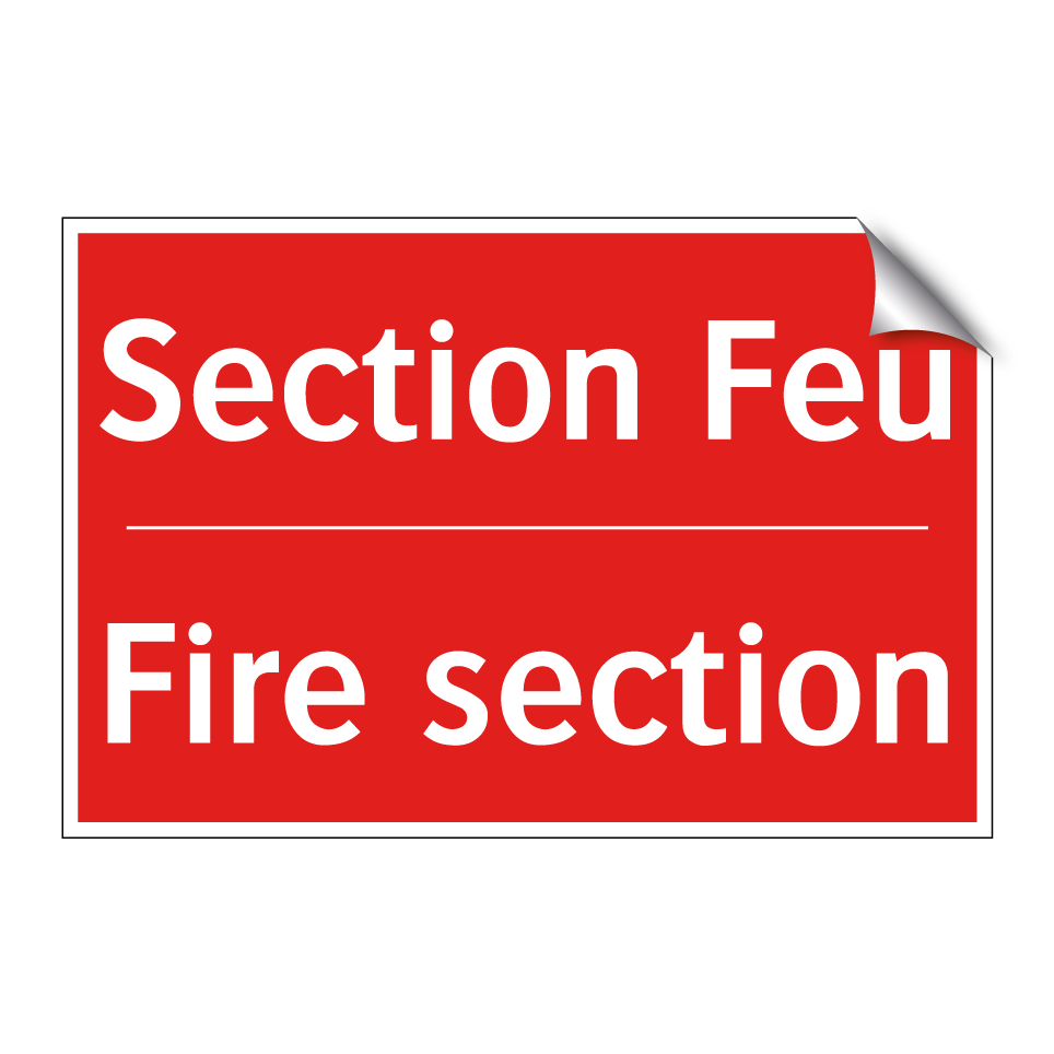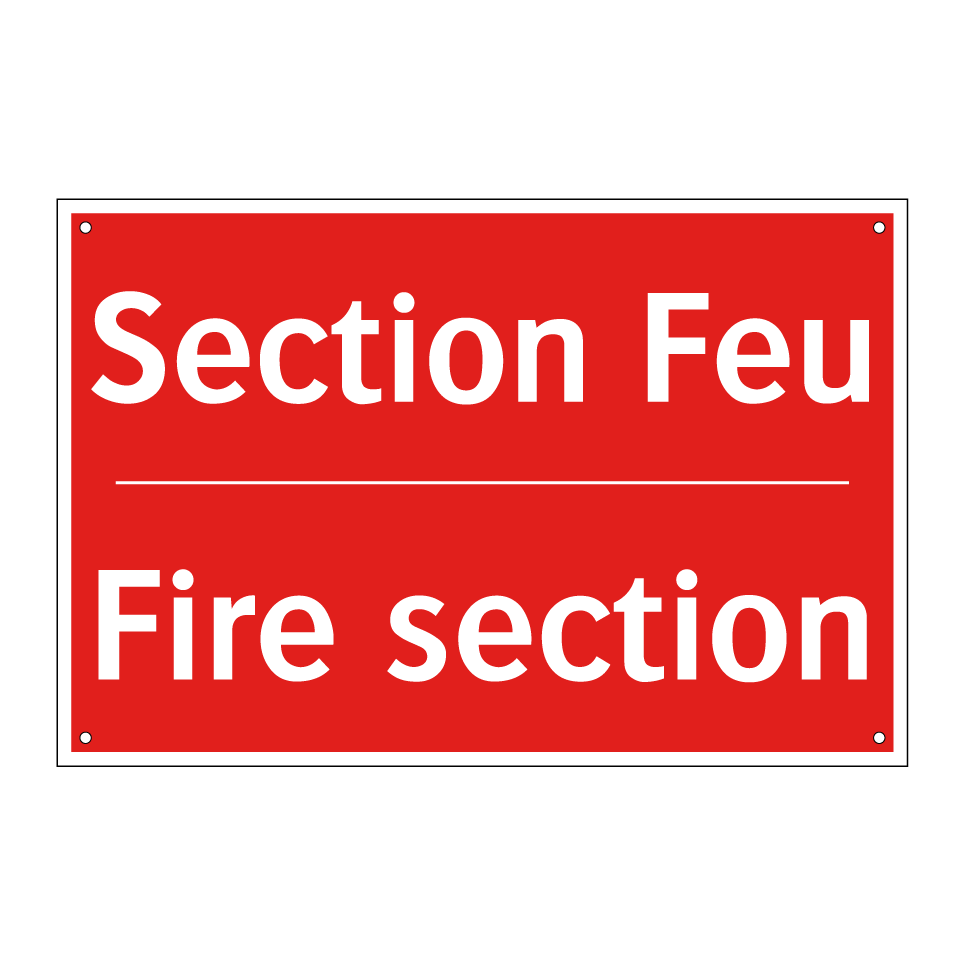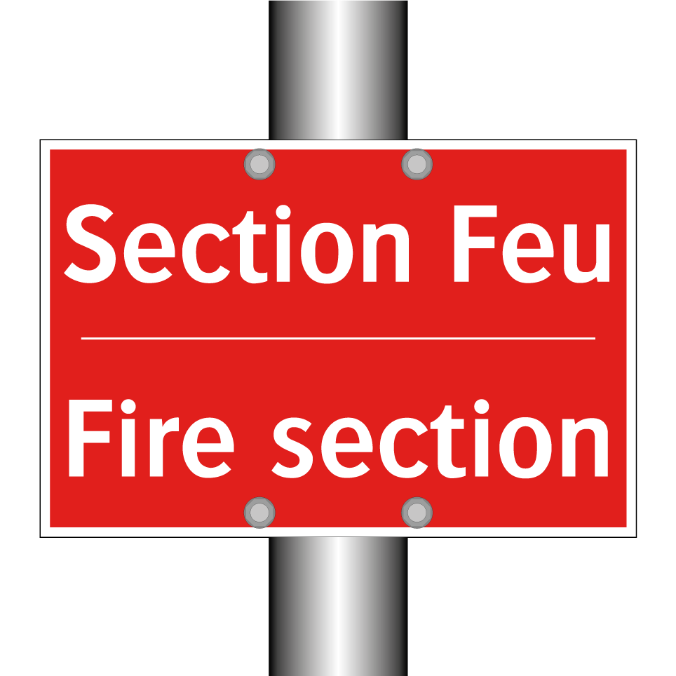 Panneau de signalisation incendie bilingue avec texte en français : "Section Feu", et en anglais : "Fire section"