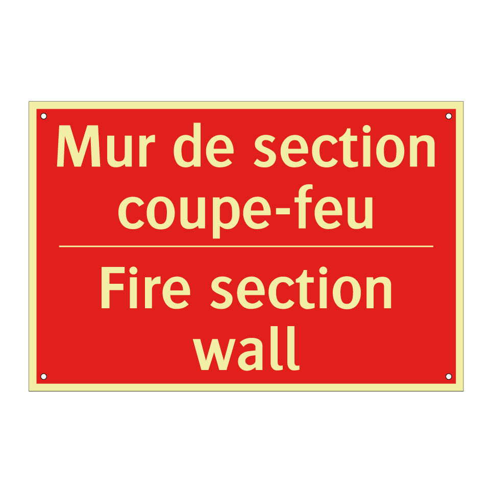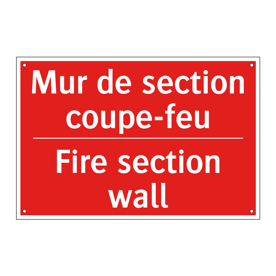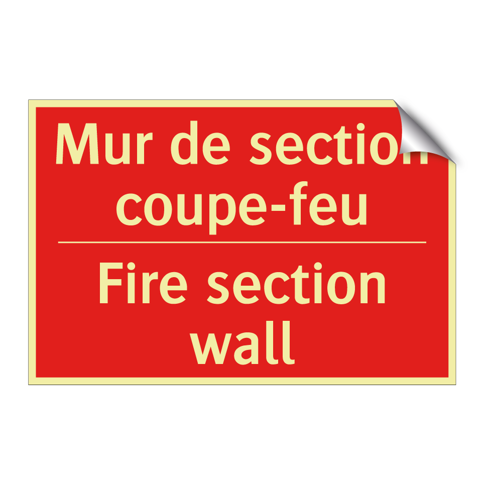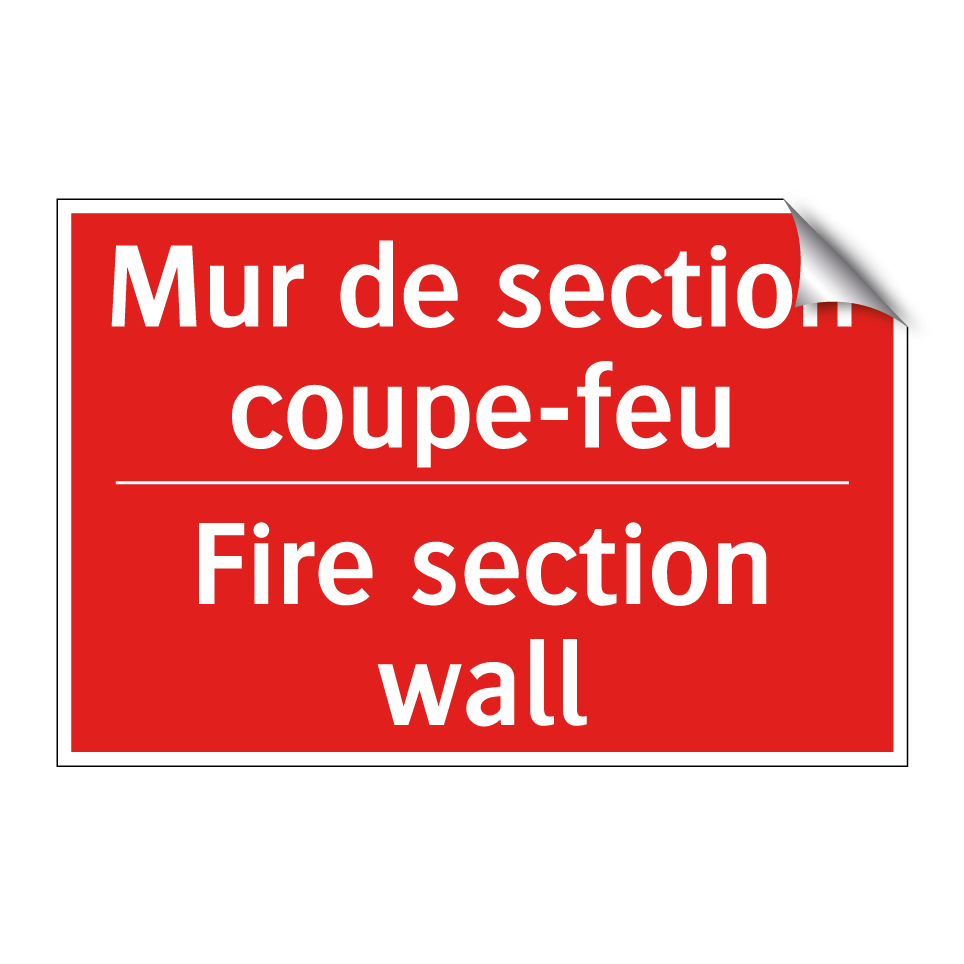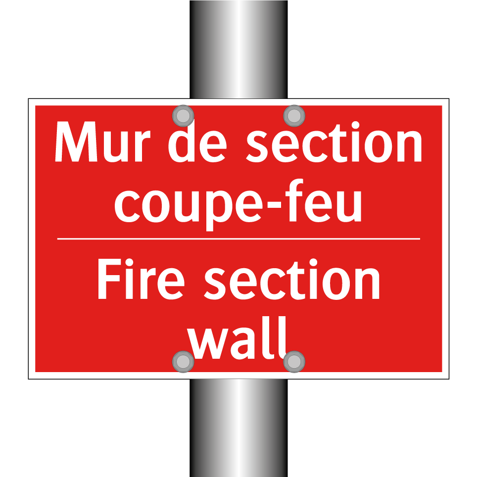 Panneau de signalisation incendie bilingue avec texte en français : "Mur de section coupe-feu", et en anglais : "Fire section wall"