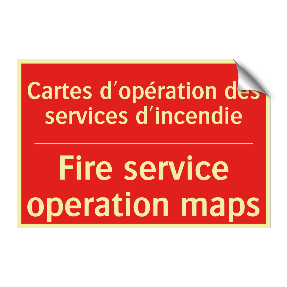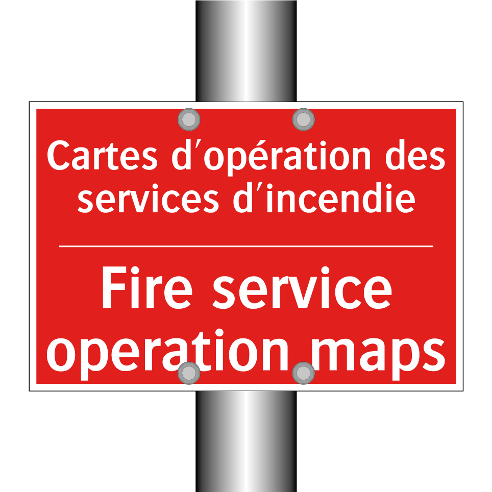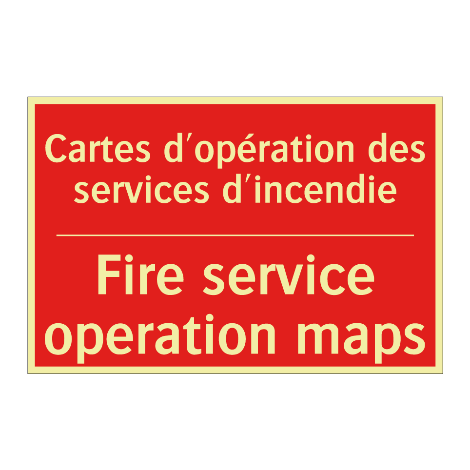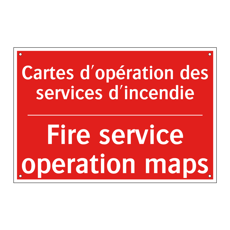 Panneau de signalisation incendie bilingue avec texte en français : "Cartes d'opération des services d'incendie", et en anglais : "Fire service operation maps"