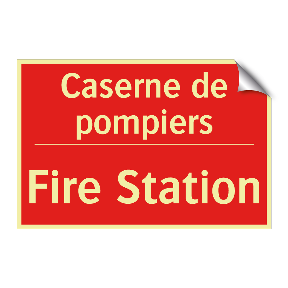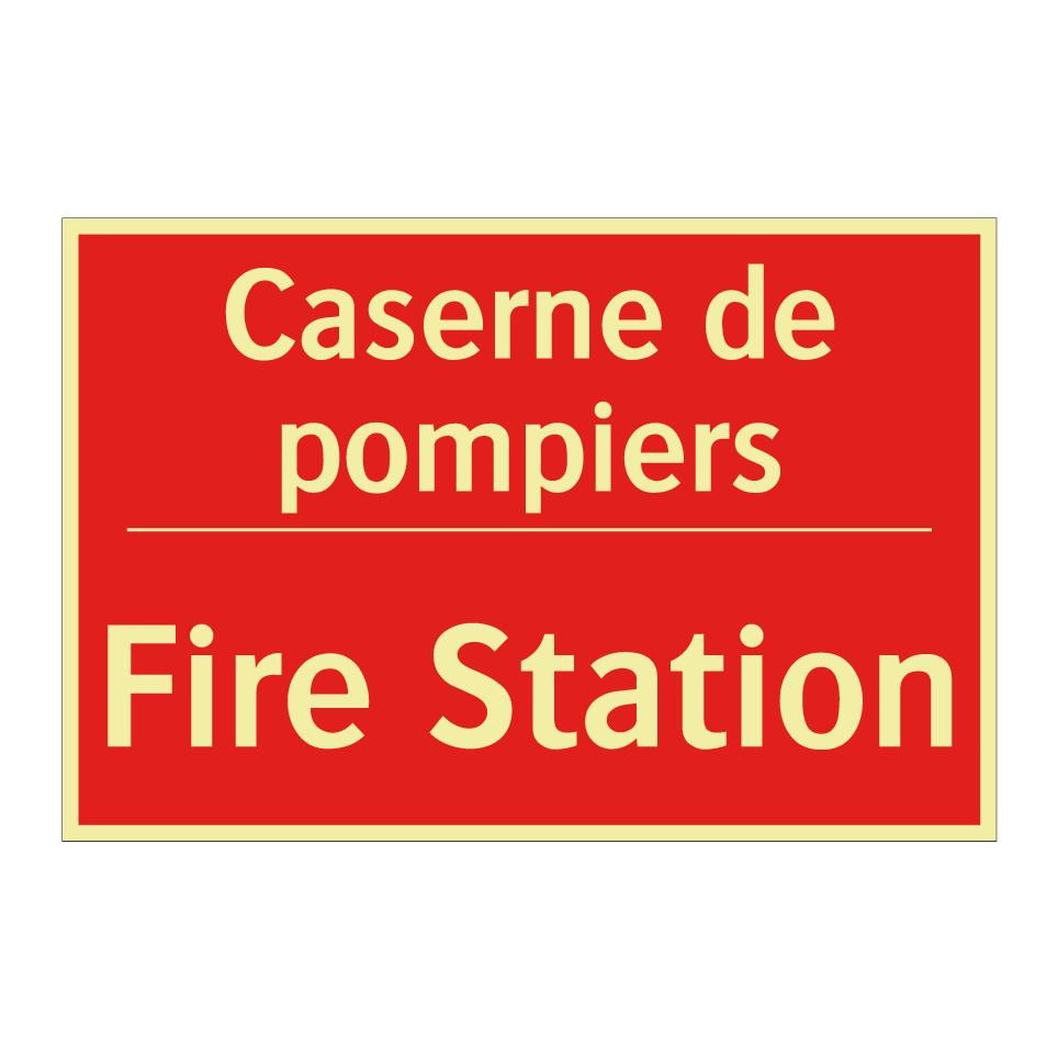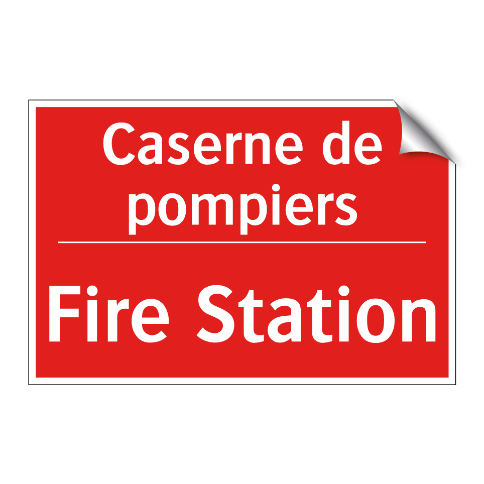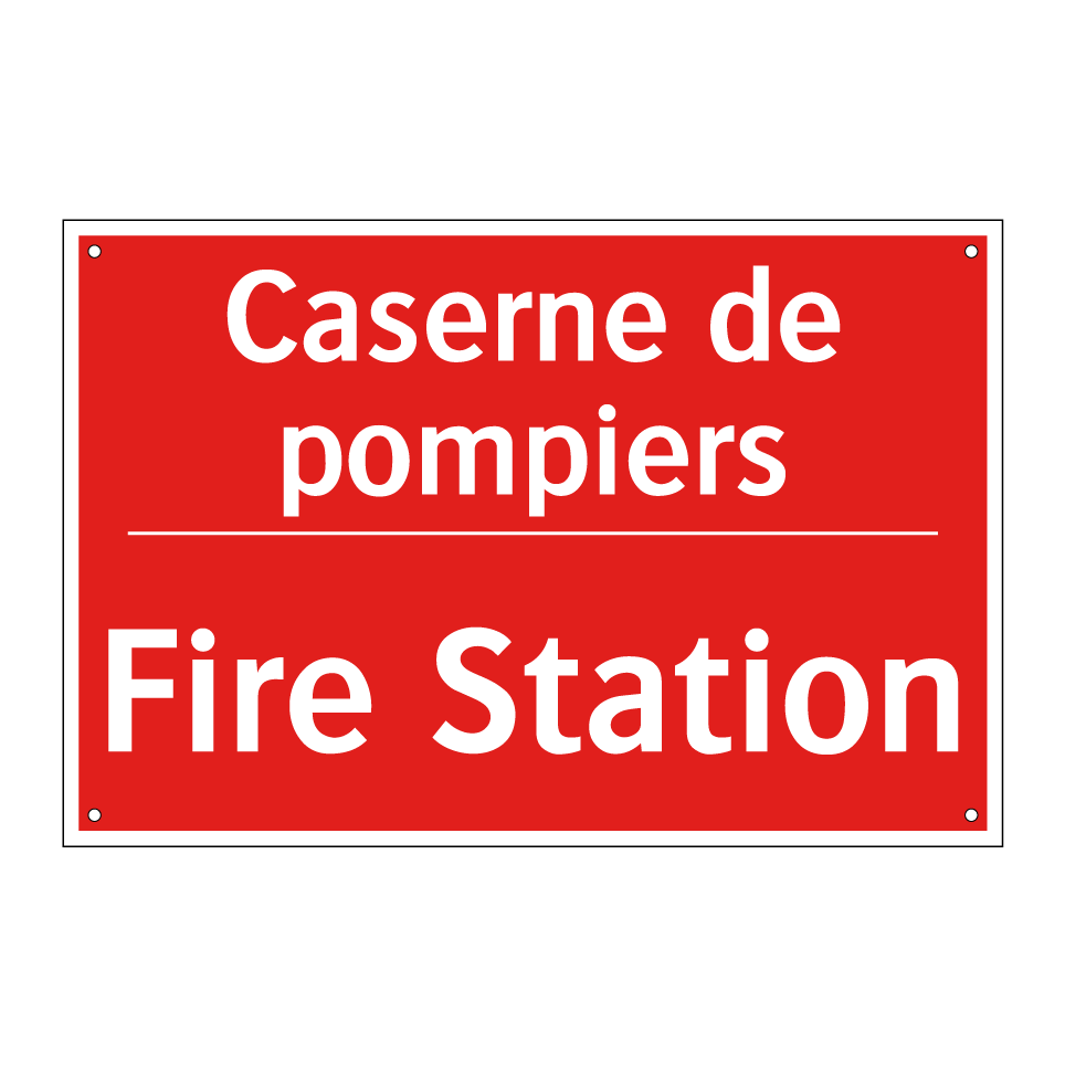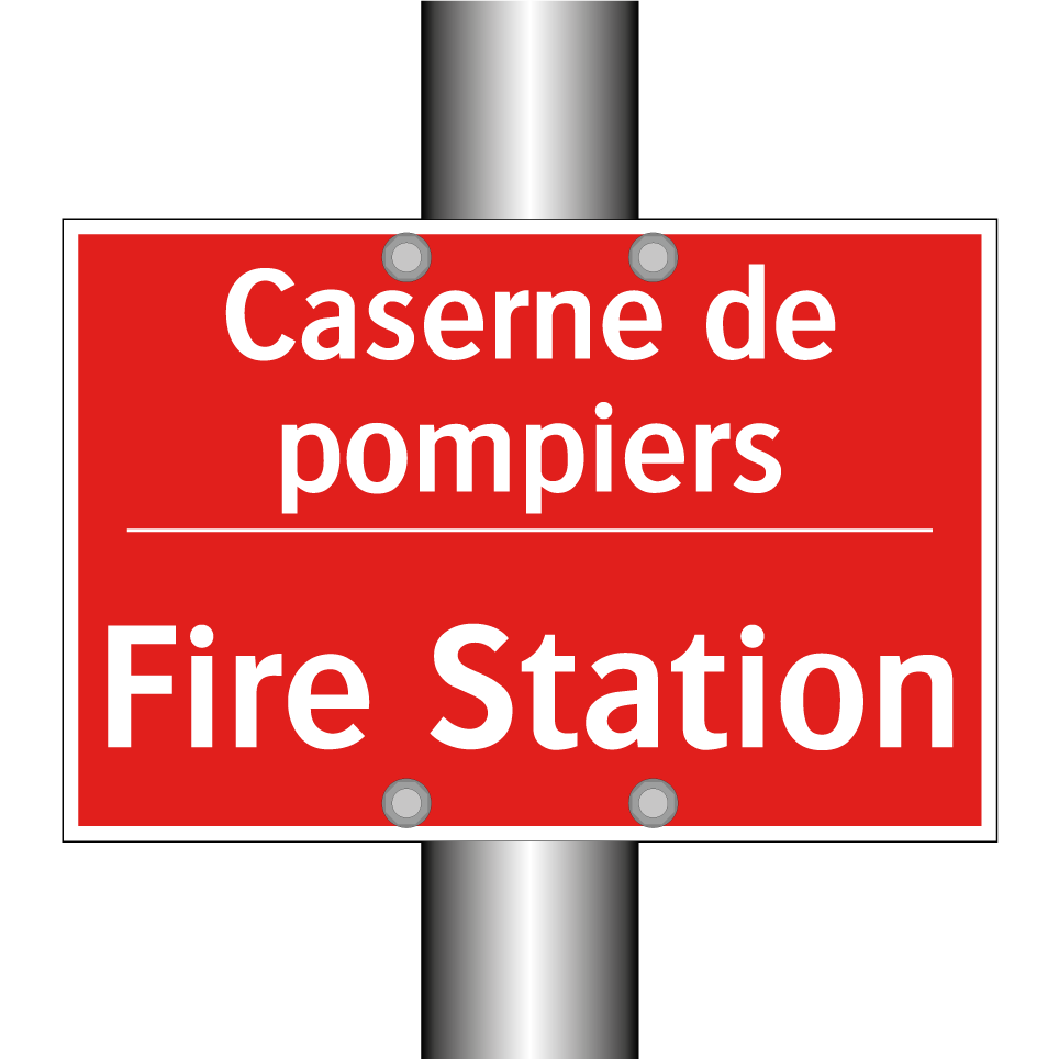 Panneau de signalisation incendie bilingue avec texte en français : "Caserne de pompiers", et en anglais : "Fire Station"