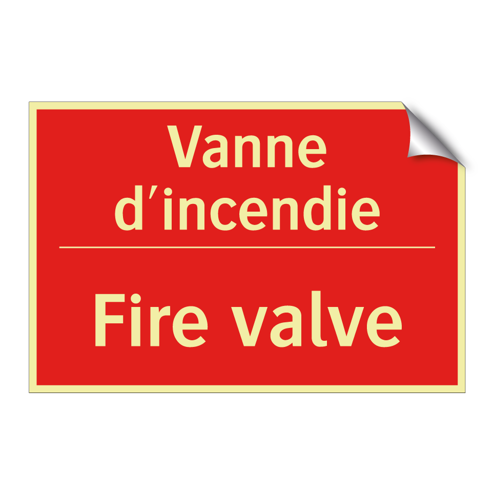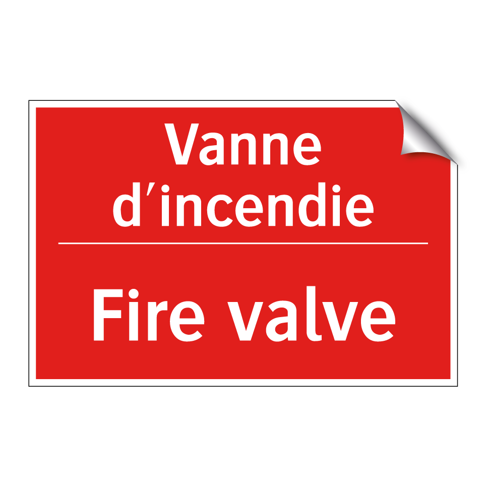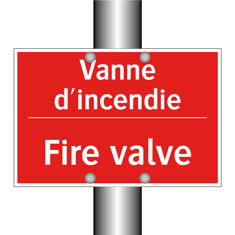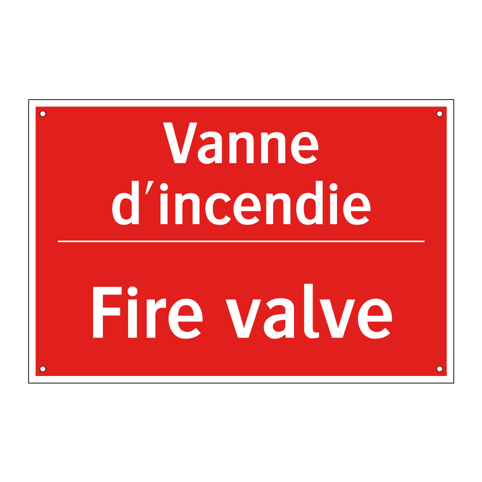 Panneau de signalisation incendie bilingue avec texte en français : "Vanne d'incendie", et en anglais : "Fire valve"