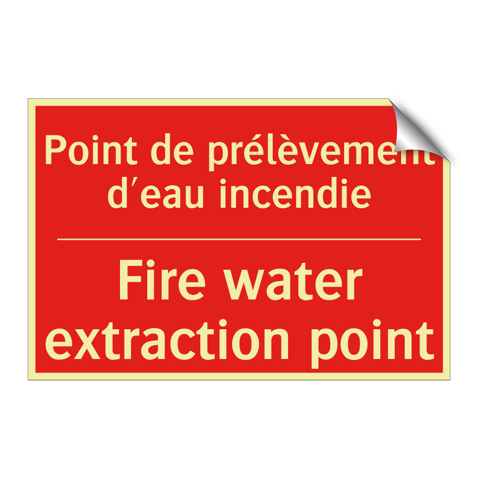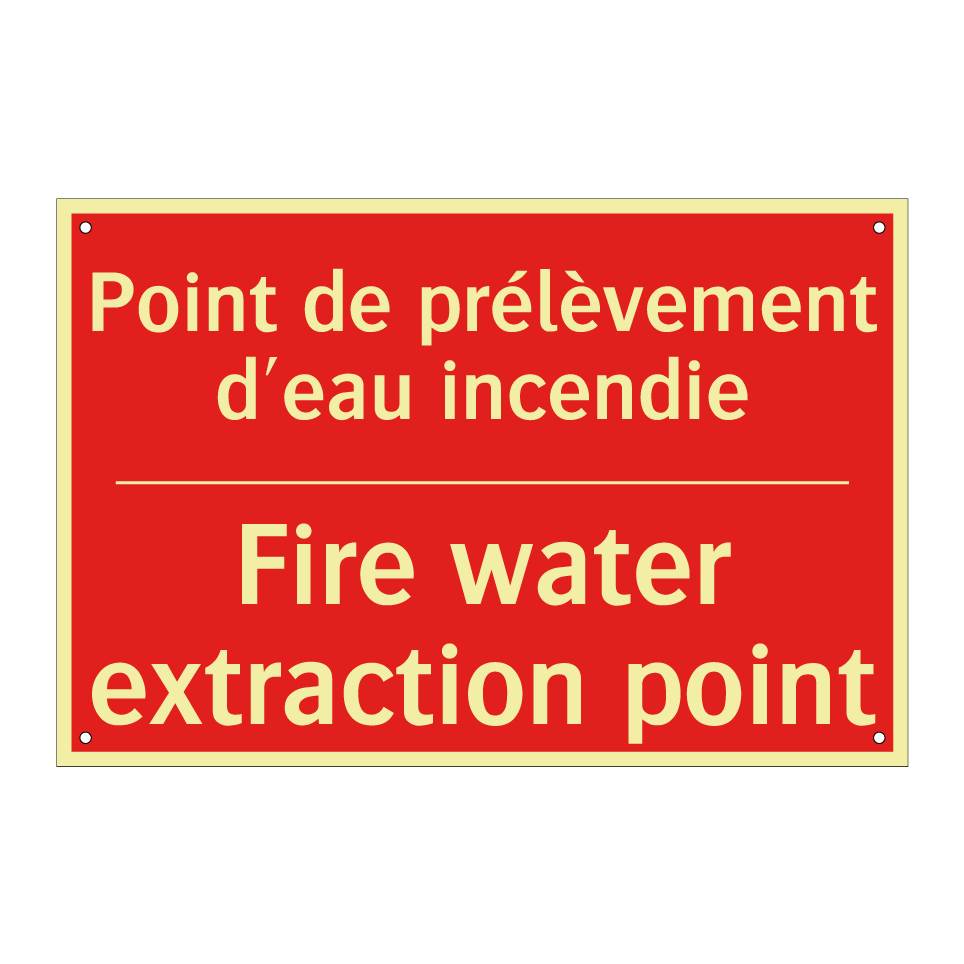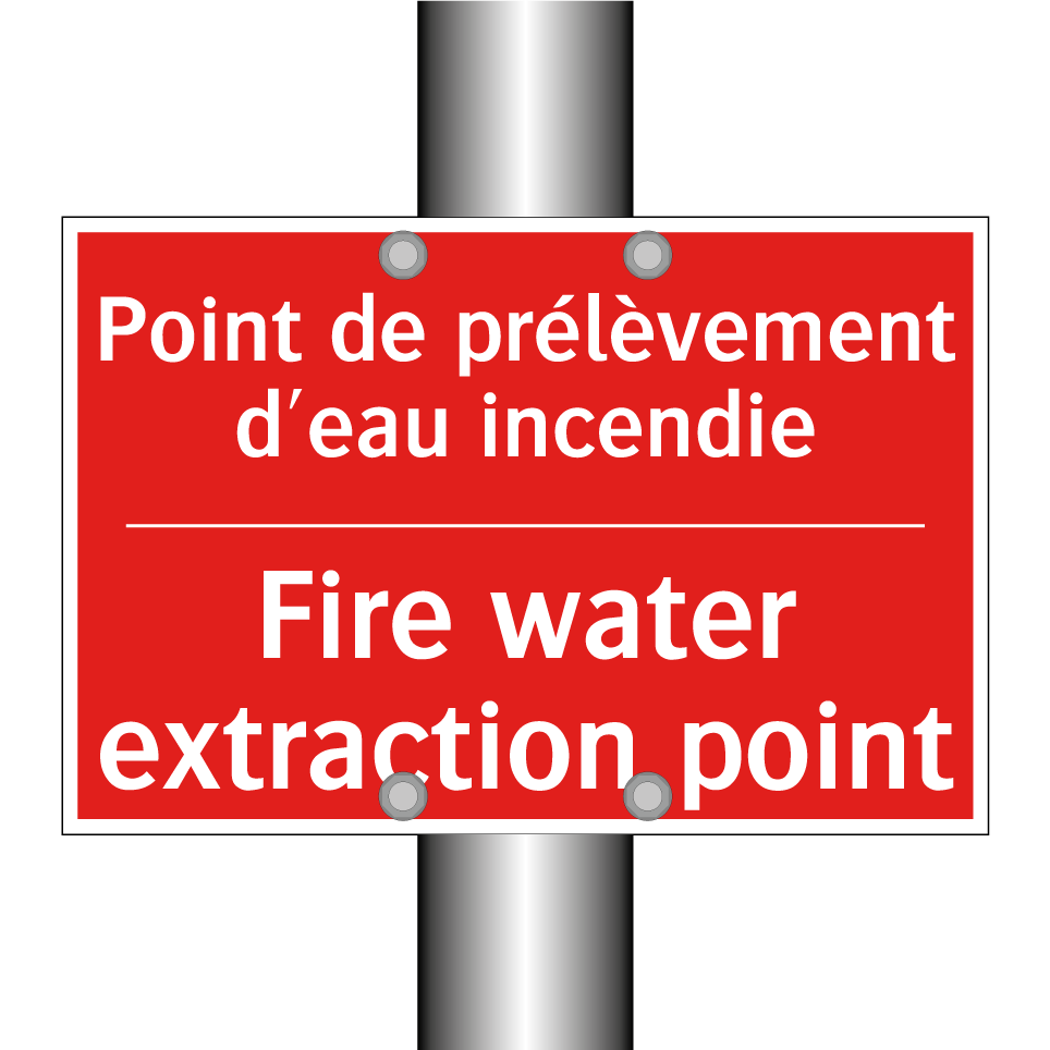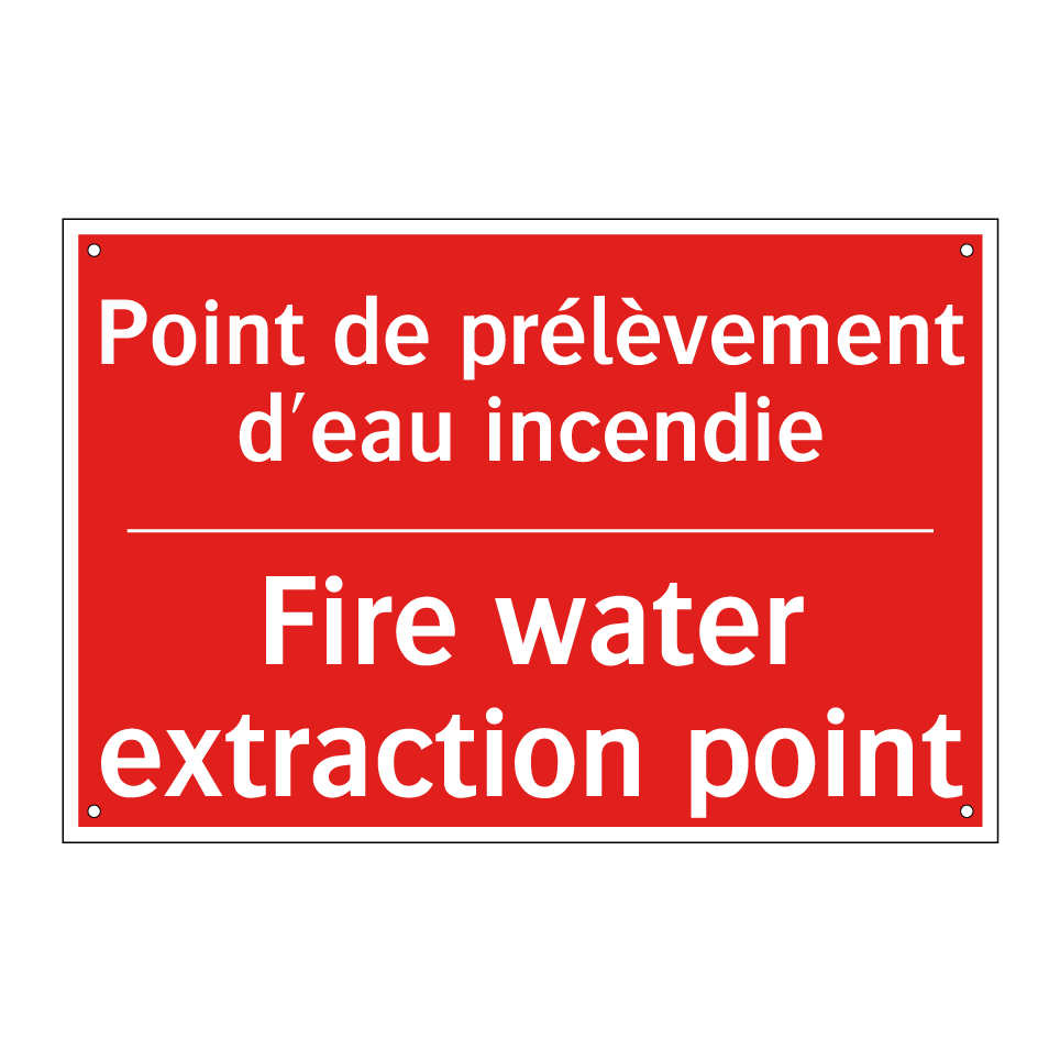 Panneau de signalisation incendie bilingue avec texte en français : "Point de prélèvement d'eau incendie", et en anglais : "Fire water extraction point"