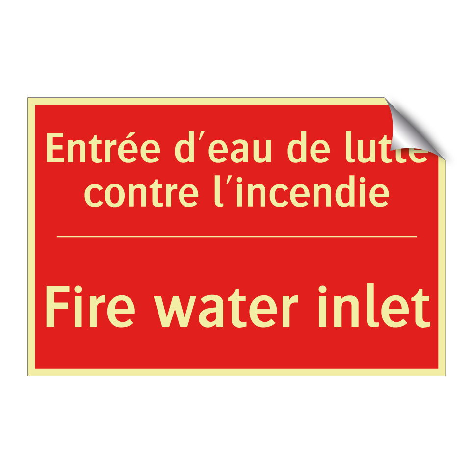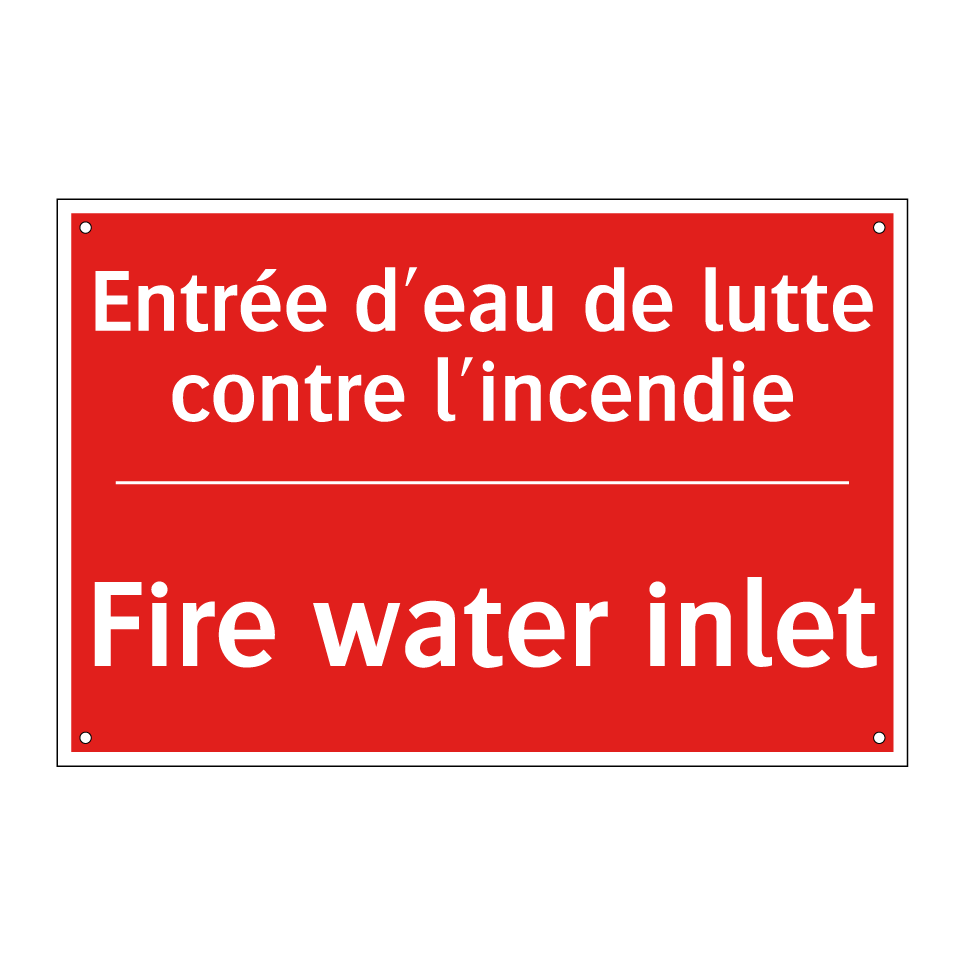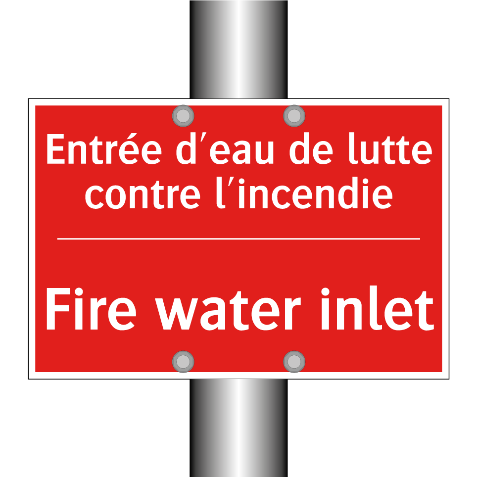Panneau de signalisation incendie bilingue avec texte en français : "Entrée d'eau de lutte contre l'incendie", et en anglais : "Fire water inlet"