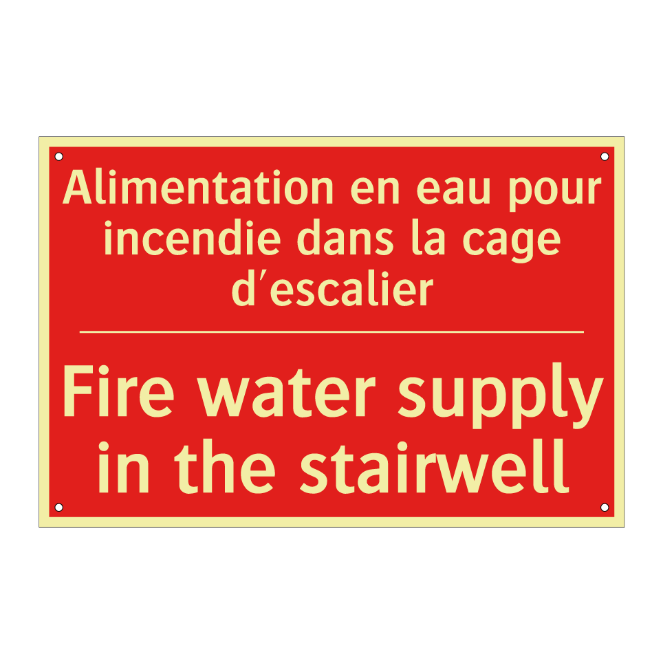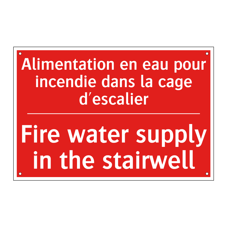 Panneau de signalisation incendie bilingue avec texte en français : "Alimentation en eau pour incendie dans la cage d'escalier", et en anglais : "Fire water supply in the stairwell"