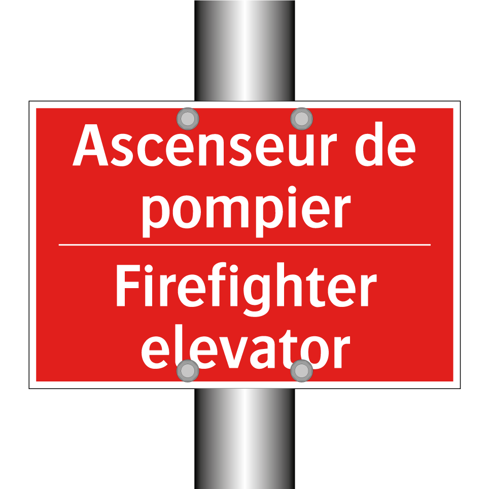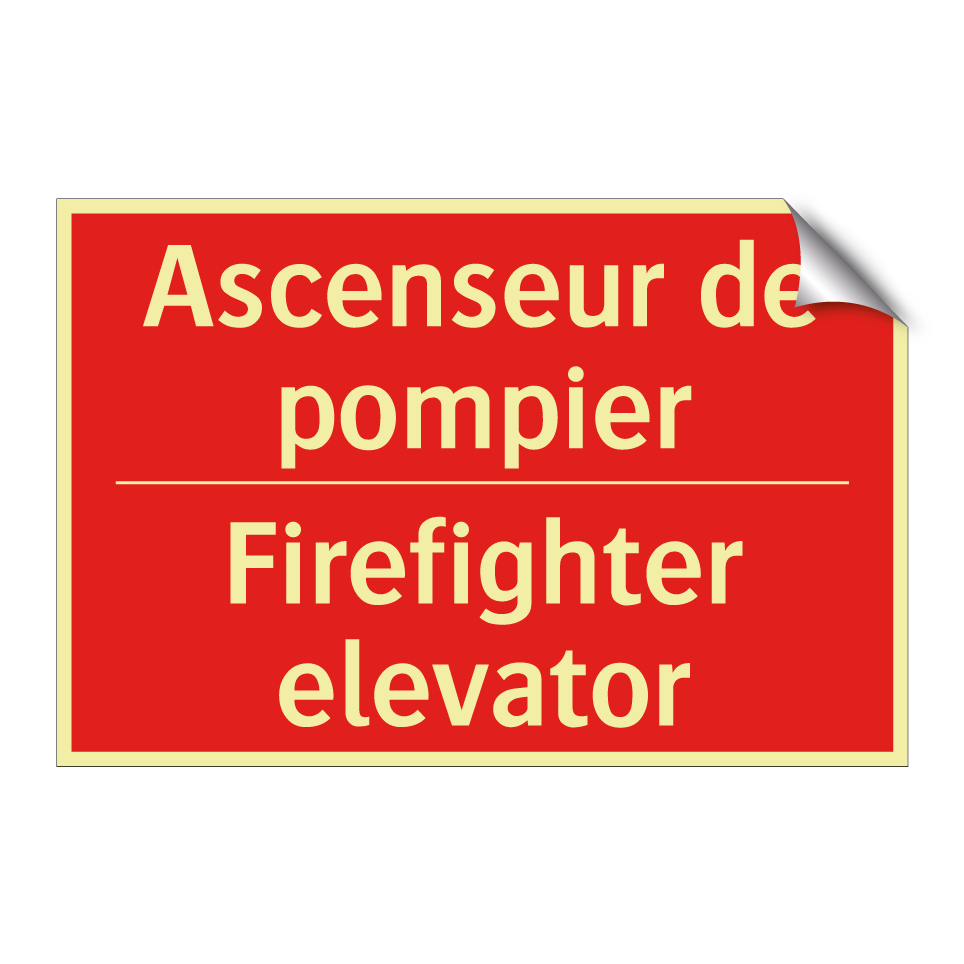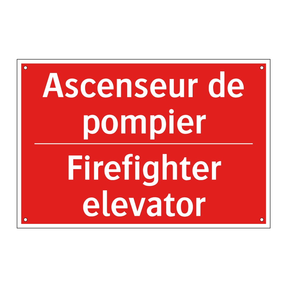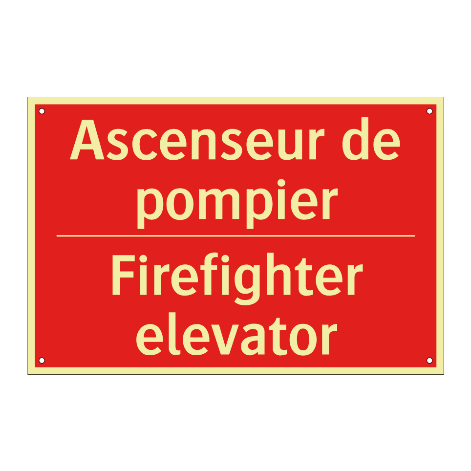 Panneau de signalisation incendie bilingue avec texte en français : "Ascenseur de pompier", et en anglais : "Firefighter elevator"
