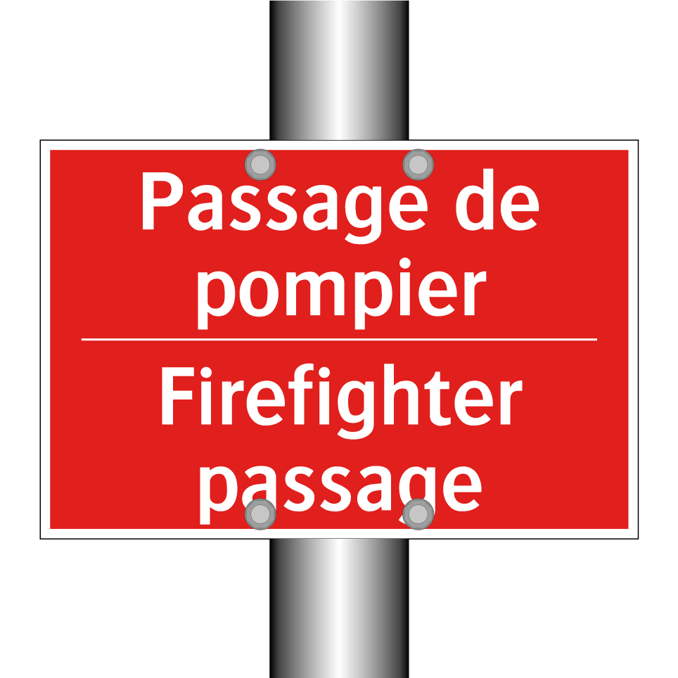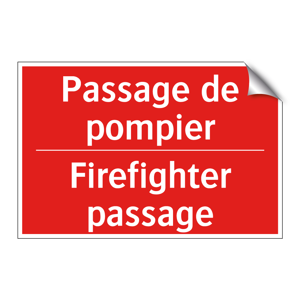 Panneau de signalisation incendie bilingue avec texte en français : "Passage de pompier", et en anglais : "Firefighter passage"