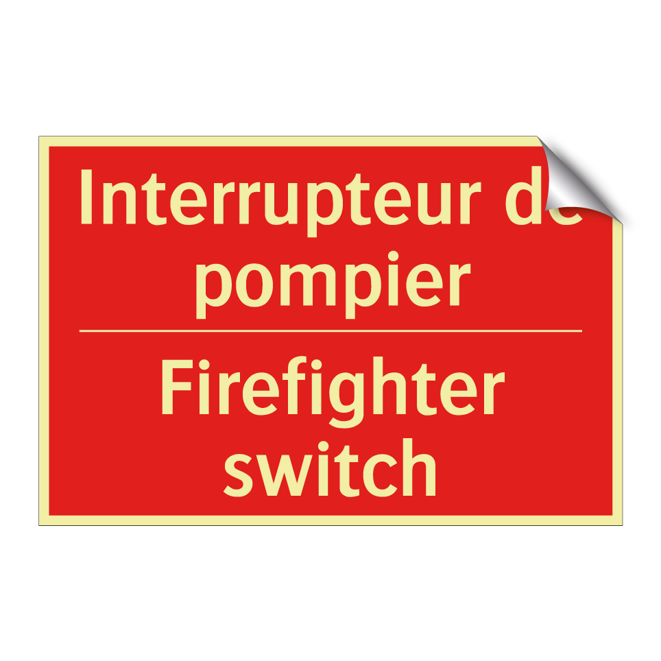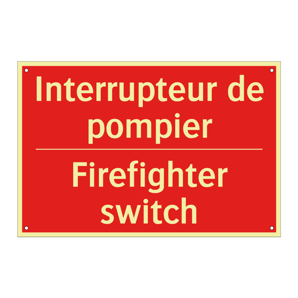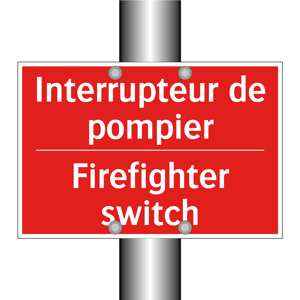 Panneau de signalisation incendie bilingue avec texte en français : "Interrupteur de pompier", et en anglais : "Firefighter switch"