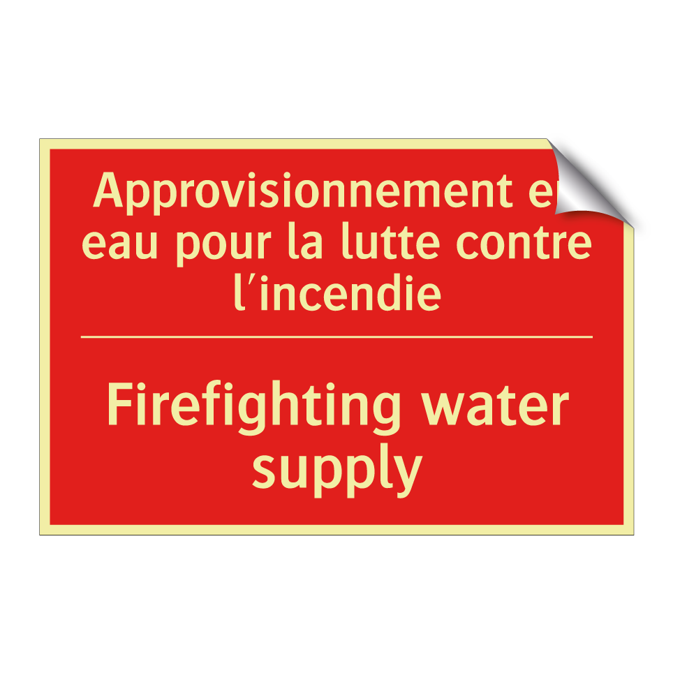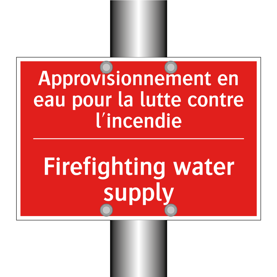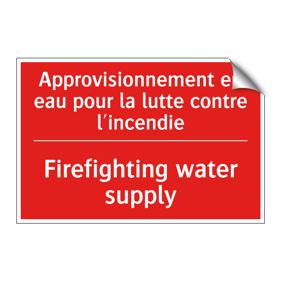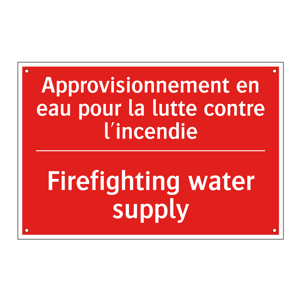 Panneau de signalisation incendie bilingue avec texte en français : "Approvisionnement en eau pour la lutte contre l'incendie", et en anglais : "Firefighting water supply"
