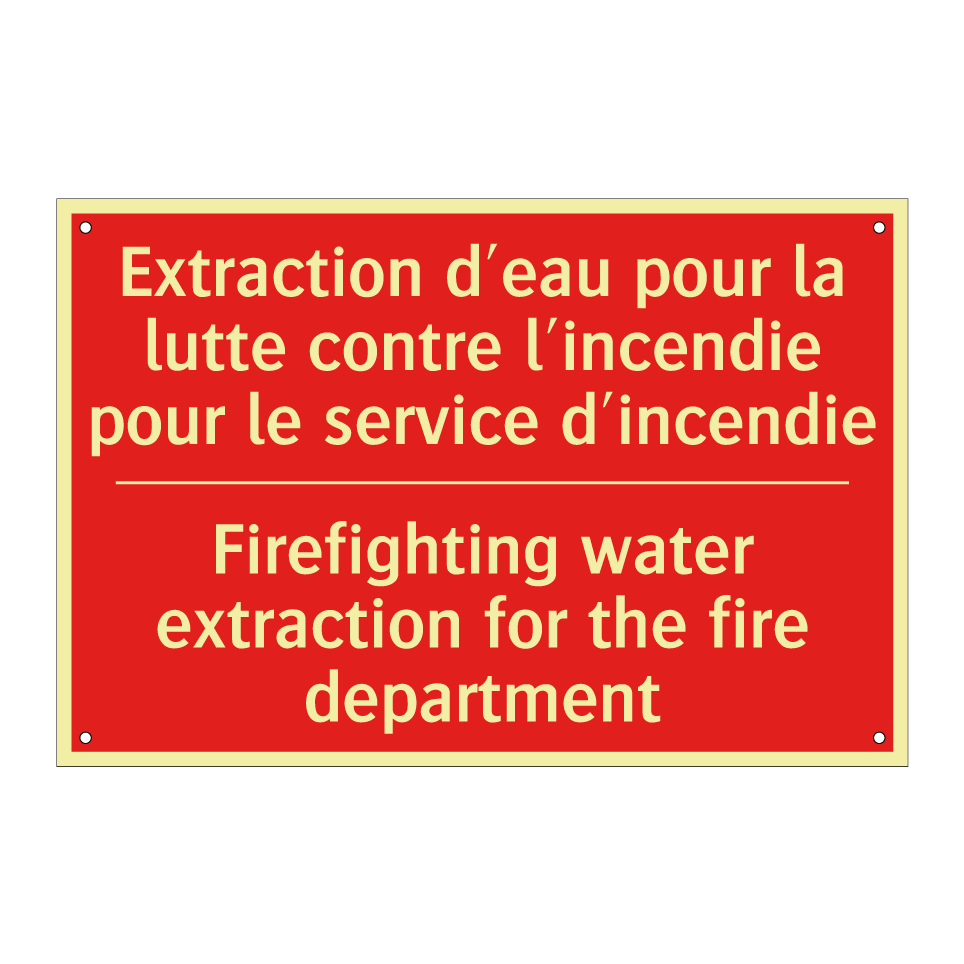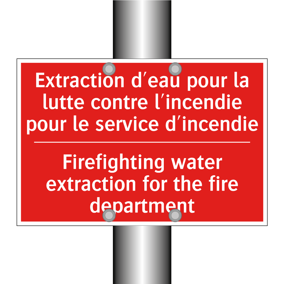 Panneau de signalisation incendie bilingue avec texte en français : "Extraction d'eau pour la lutte contre l'incendie pour le service d'incendie", et en anglais : "Firefighting water extraction for the fire department"