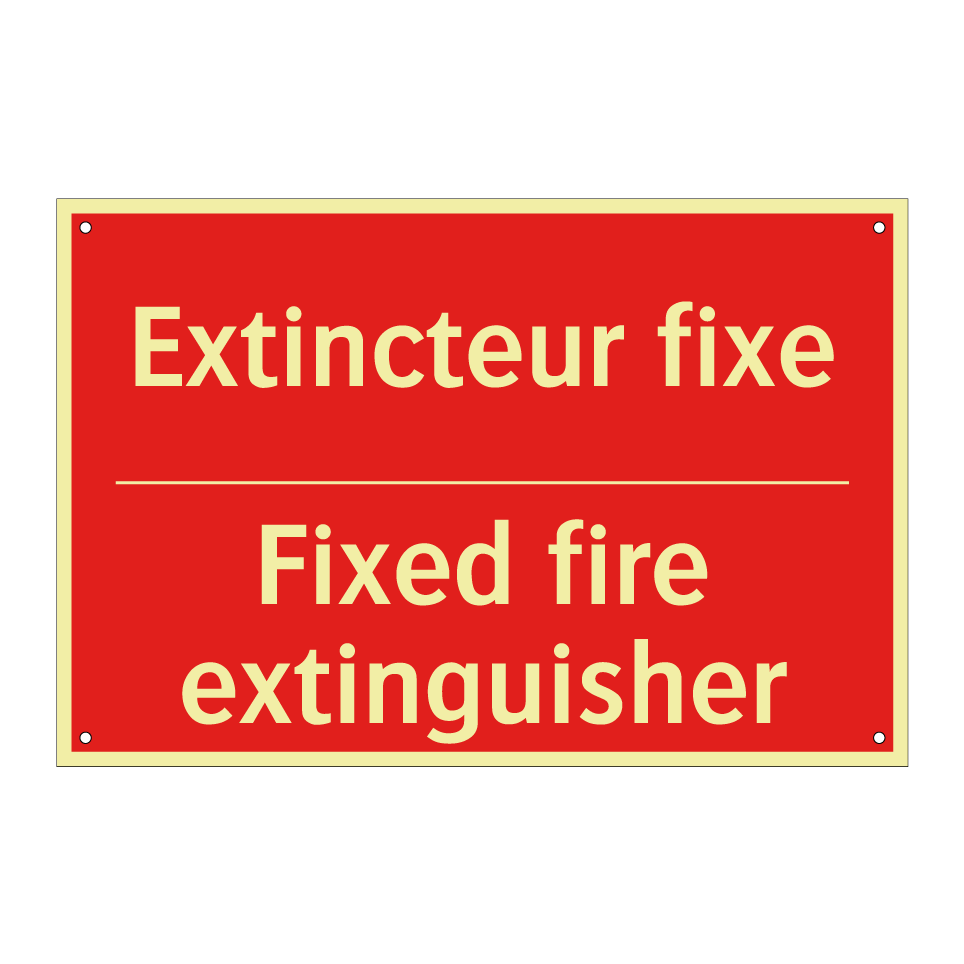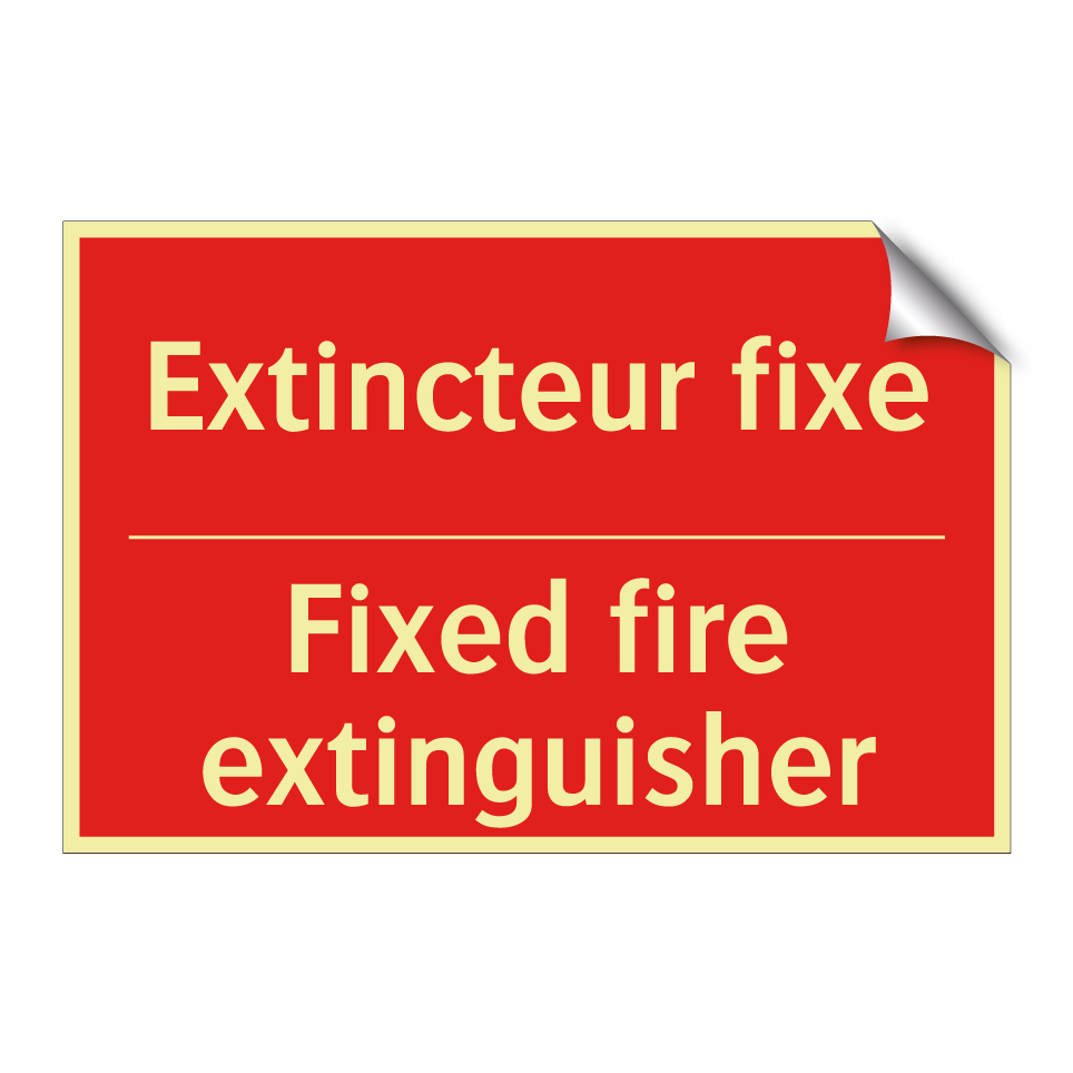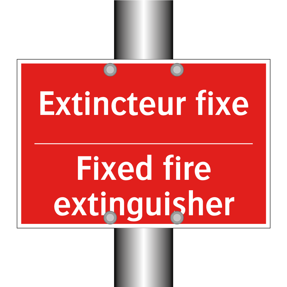 Panneau de signalisation incendie bilingue avec texte en français : "Extincteur fixe", et en anglais : "Fixed fire extinguisher"