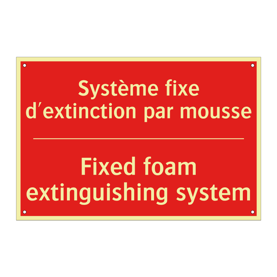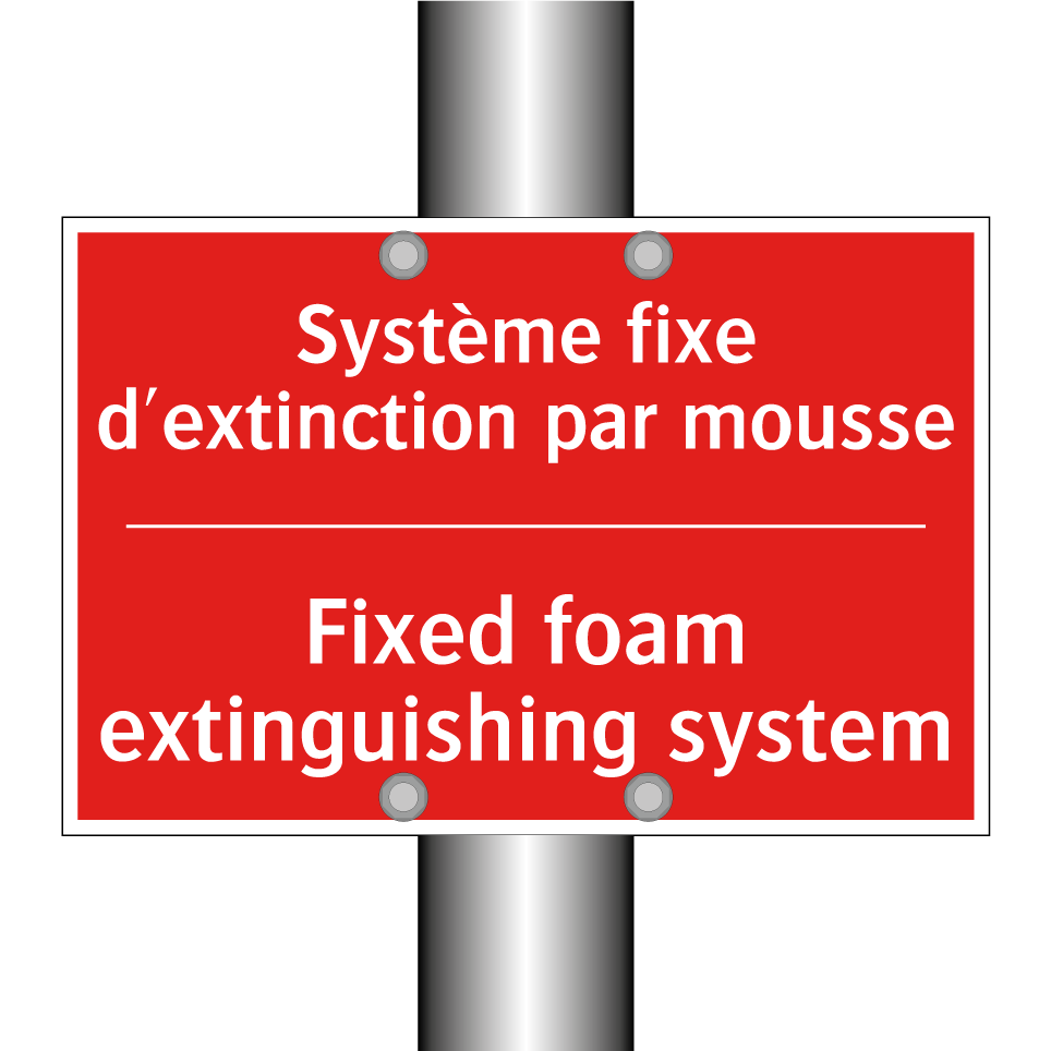 Panneau de signalisation incendie bilingue avec texte en français : "Système fixe d'extinction par mousse", et en anglais : "Fixed foam extinguishing system"