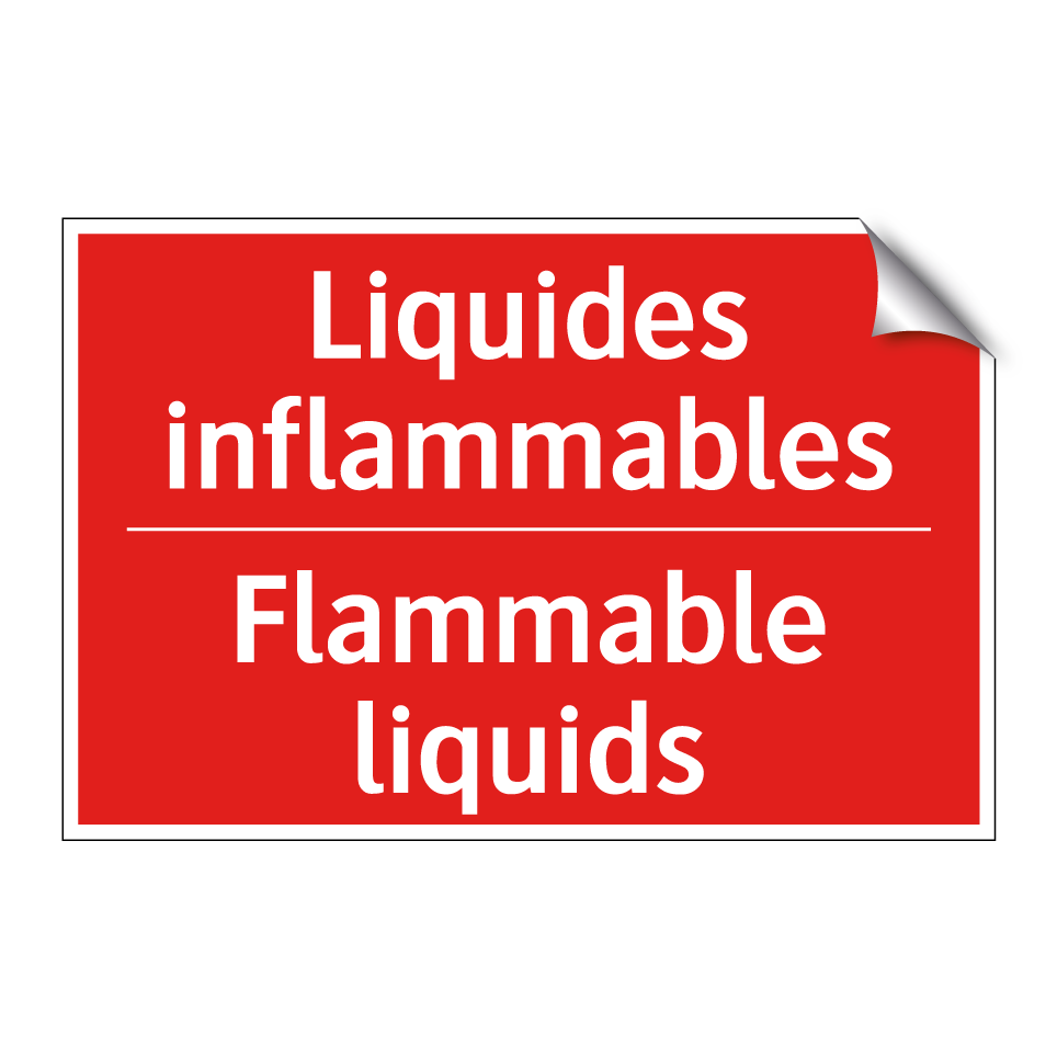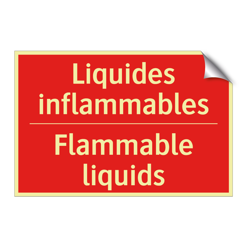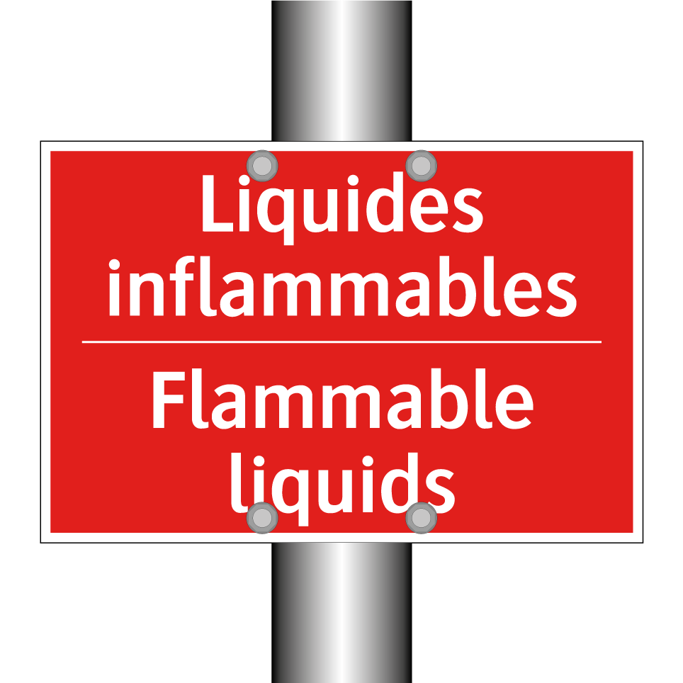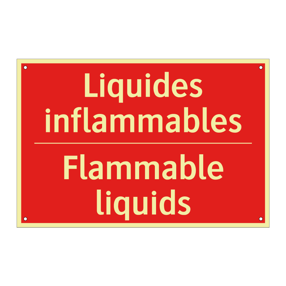 Panneau de signalisation incendie bilingue avec texte en français : "Liquides inflammables", et en anglais : "Flammable liquids"