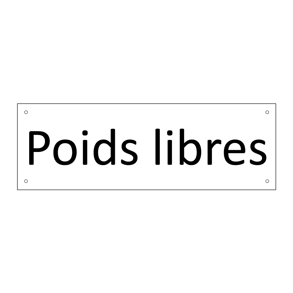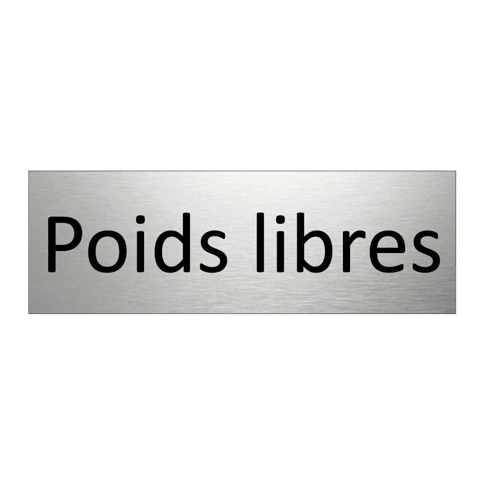 Cette enseigne est idéale pour les salles de sport et les centres de fitness, indiquant clairement les zones dédiées aux poids libres. Elle sert à guider les utilisateurs vers l'espace approprié pour leurs exercices de musculation. Parfaite pour être placée à l'entrée de la section de musculation ou sur les murs à proximité des équipements, elle assure une organisation optimale de l'espace. En utilisant des termes clairs et précis, elle contribue à une meilleure circulation et à une utilisation efficace des installations sportives.