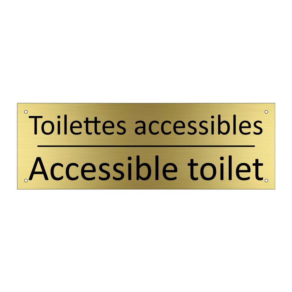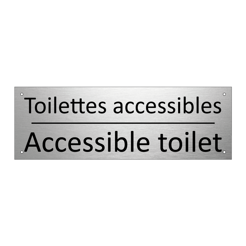 Panneau d'information avec le texte Toilettes accessibles|Accessible toilet en français et en anglais.