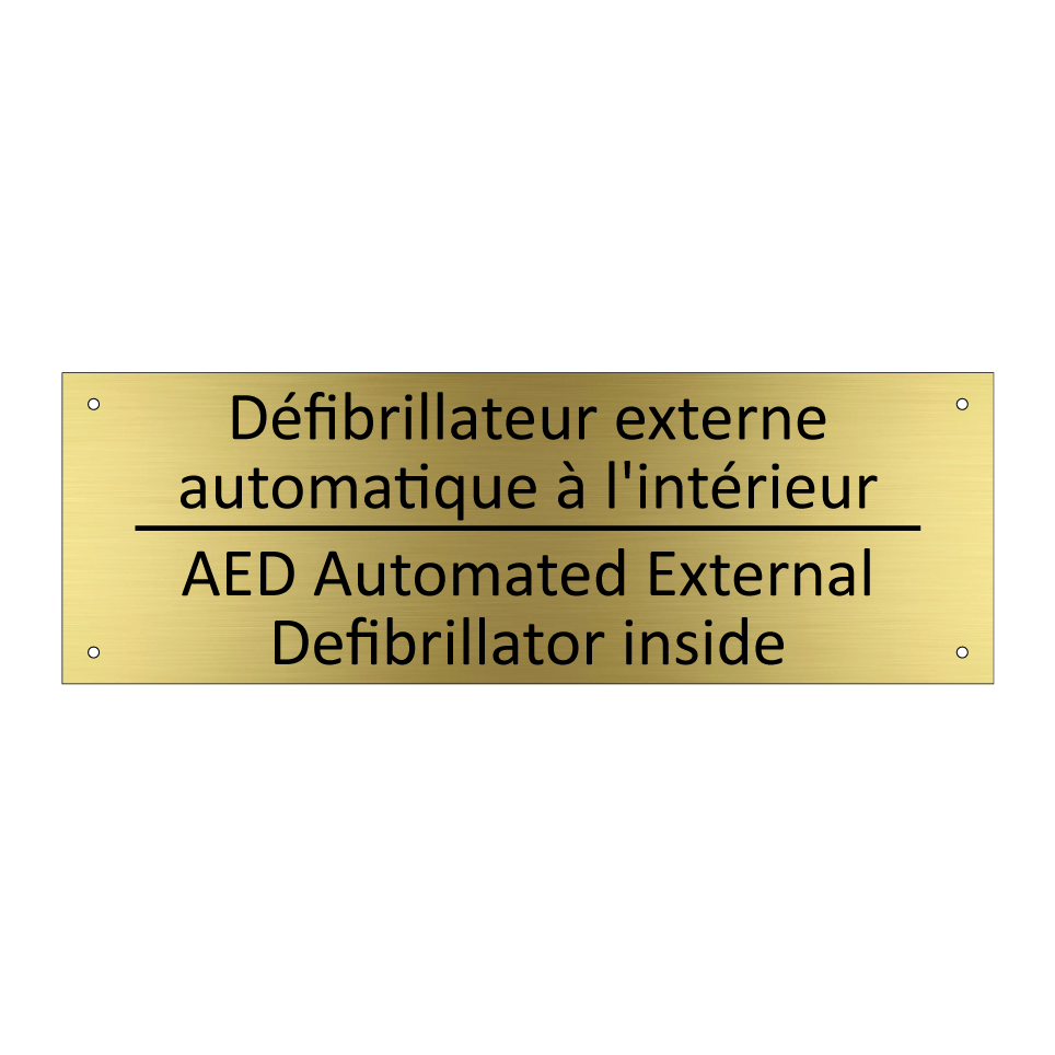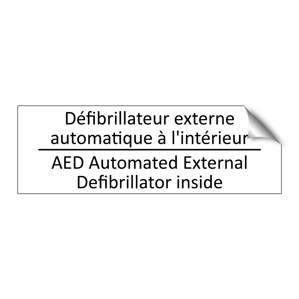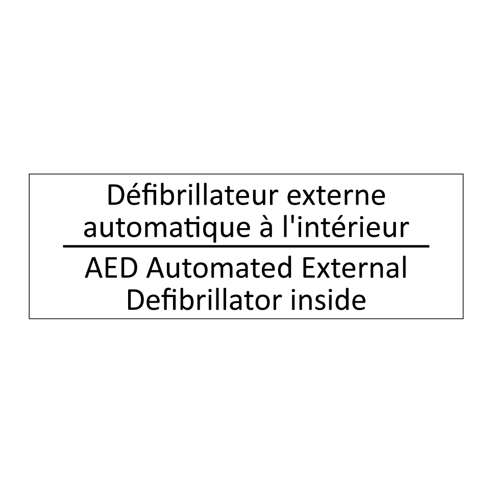 Panneau d'information avec le texte Défibrillateur externe automatique à l'intérieur|AED Automated External Defibrillator inside en français et en anglais.