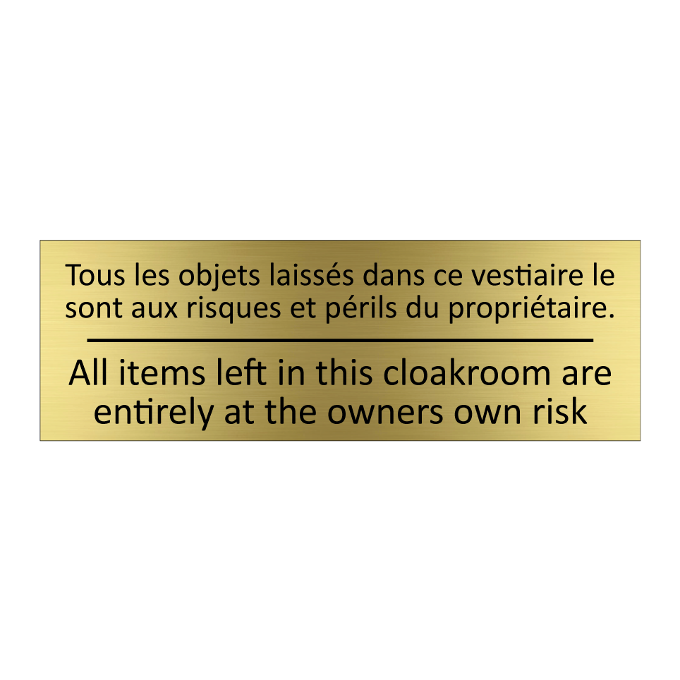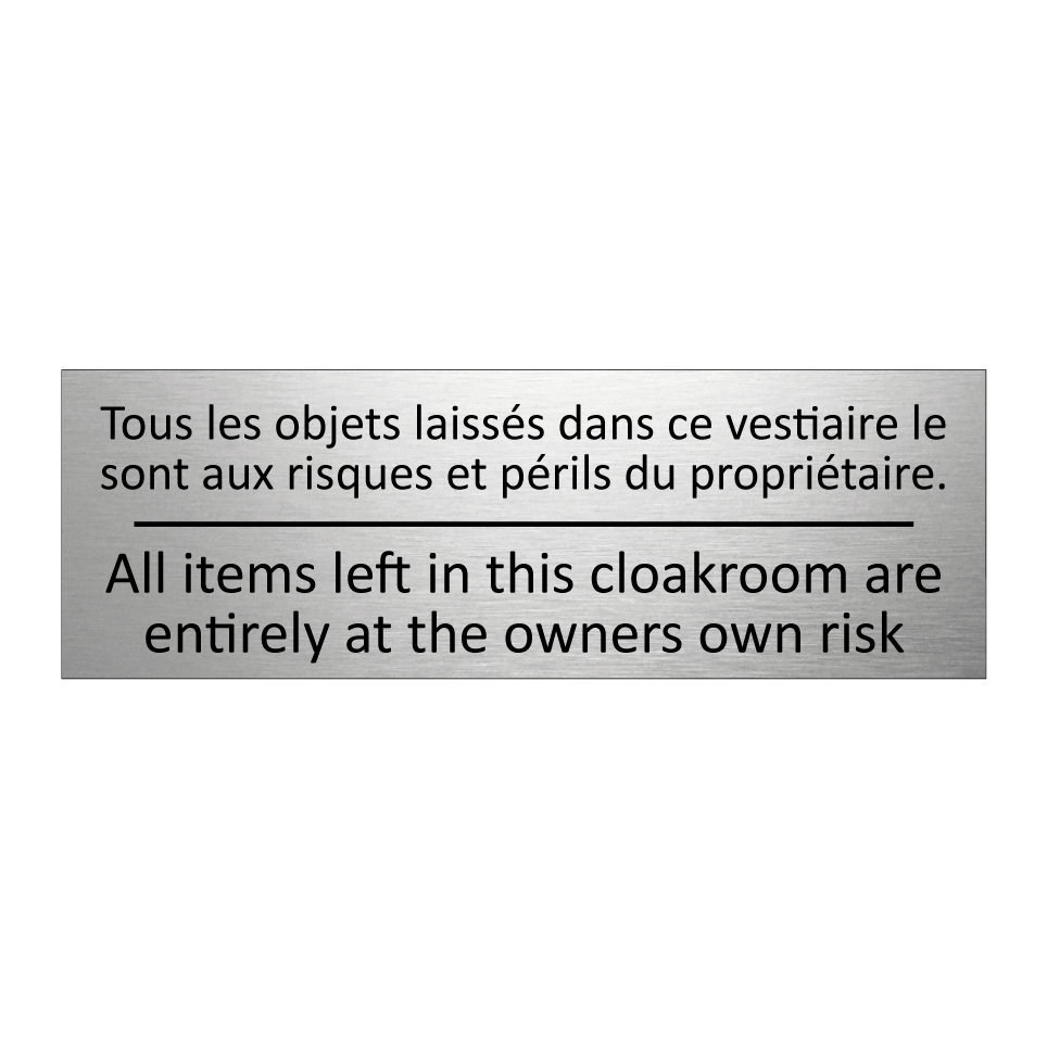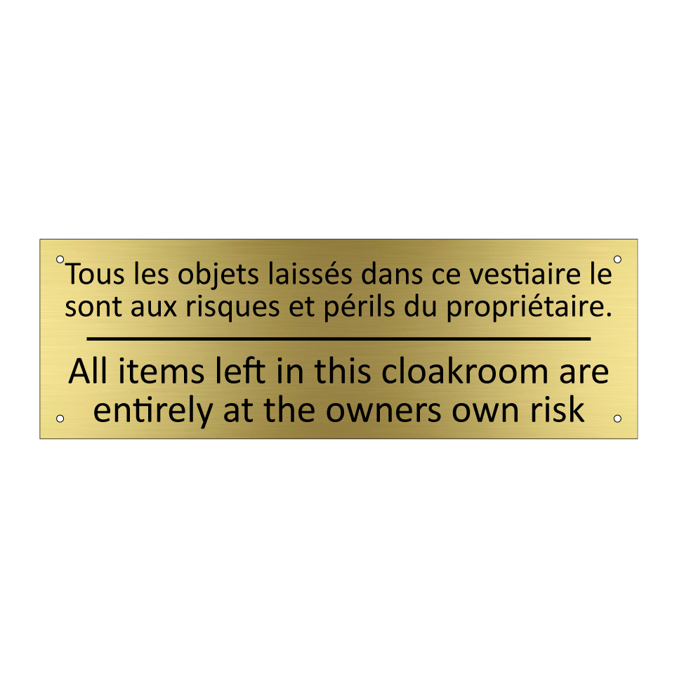 Panneau d'information avec le texte Tous les objets laissés dans ce vestiaire le sont aux risques et périls du propriétaire.|All items left in this cloakroom are entirely at the owners own risk en français et en anglais.