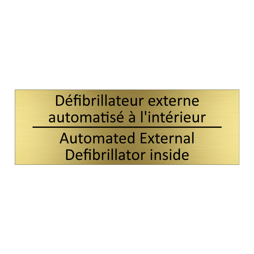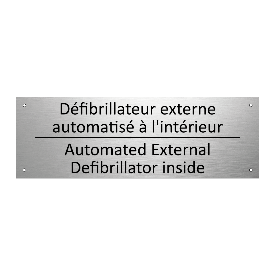 Panneau d'information avec le texte Défibrillateur externe automatisé à l'intérieur|Automated External Defibrillator inside en français et en anglais.