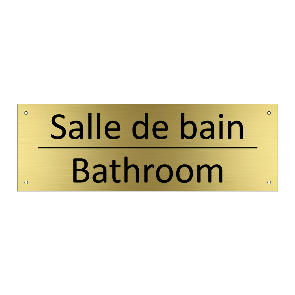 Panneau d'information avec le texte Salle de bain|Bathroom en français et en anglais.