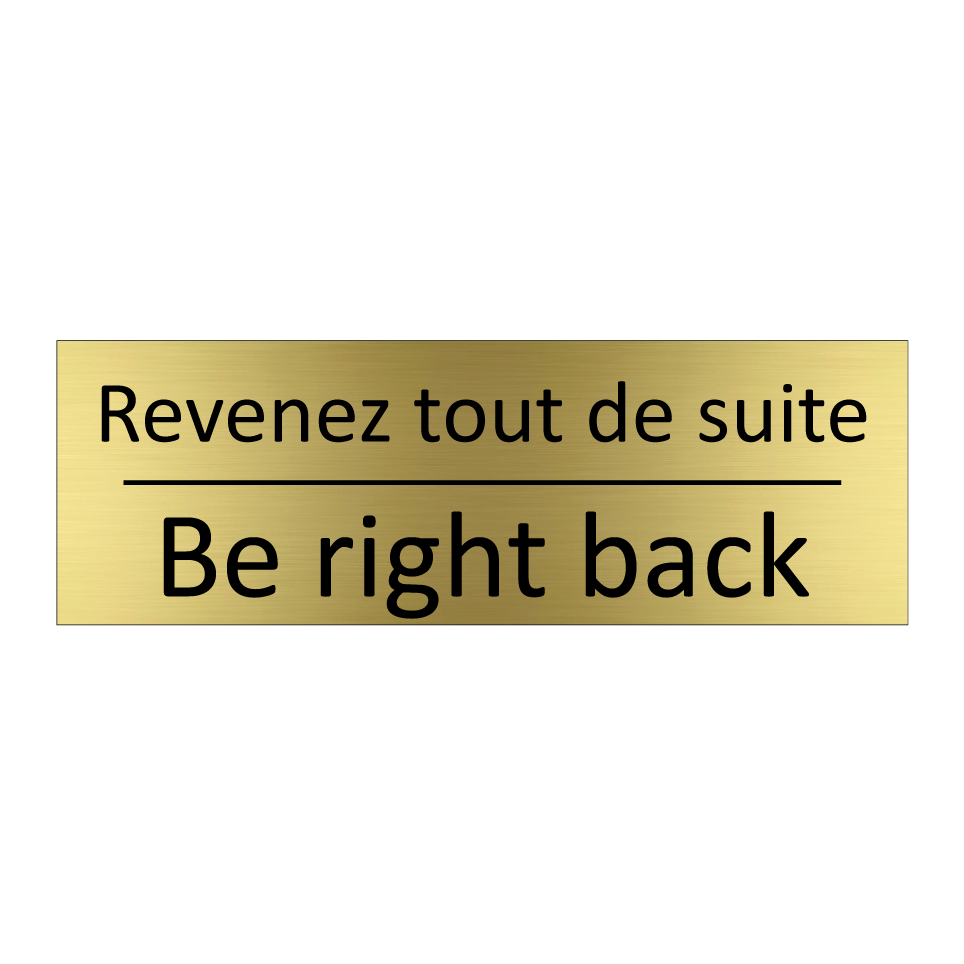 Panneau d'information avec le texte Revenez tout de suite|Be right back en français et en anglais.