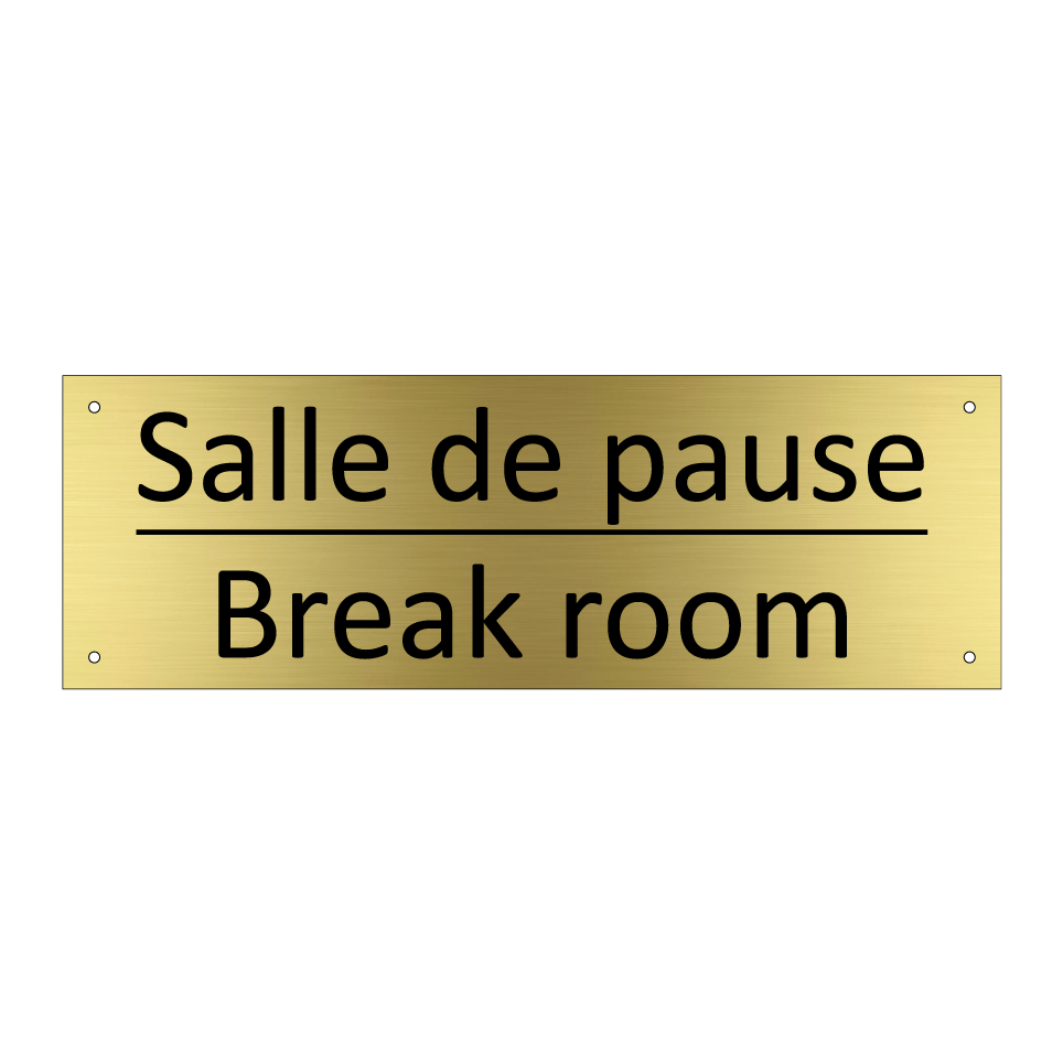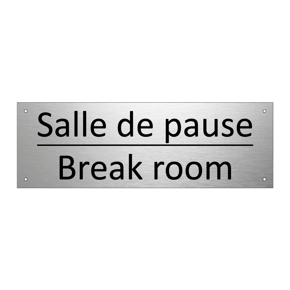Panneau d'information avec le texte Salle de pause|Break room en français et en anglais.