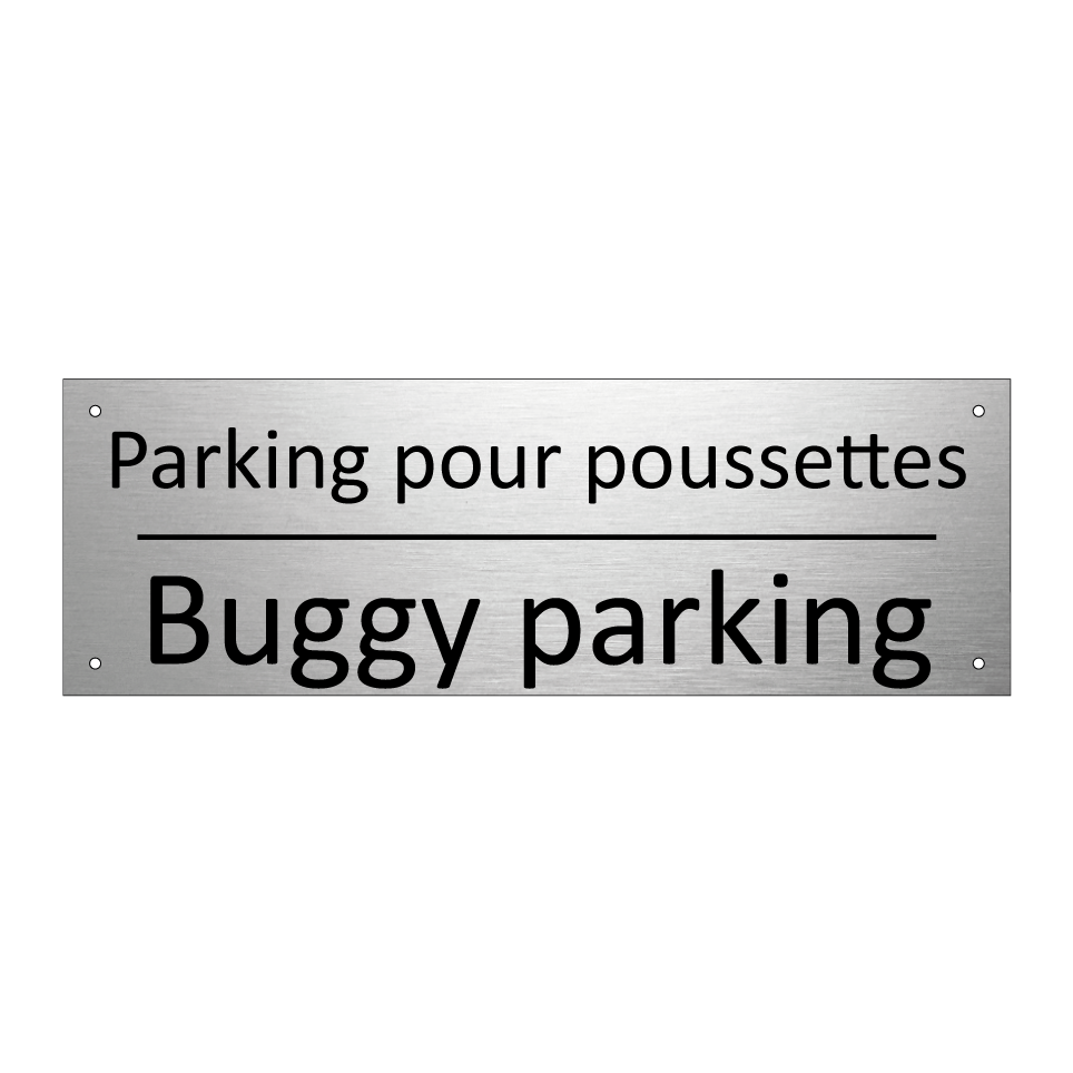Panneau d'information avec le texte Parking pour poussettes|Buggy parking en français et en anglais.