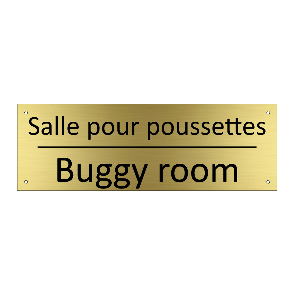 Panneau d'information avec le texte Salle pour poussettes|Buggy room en français et en anglais.