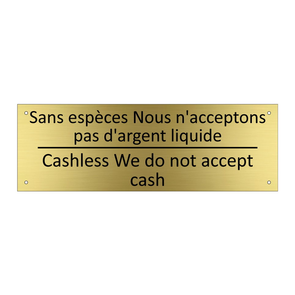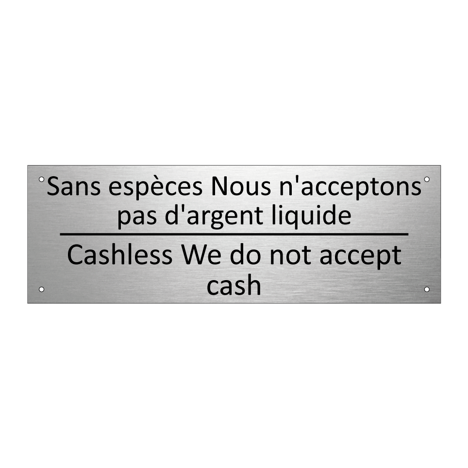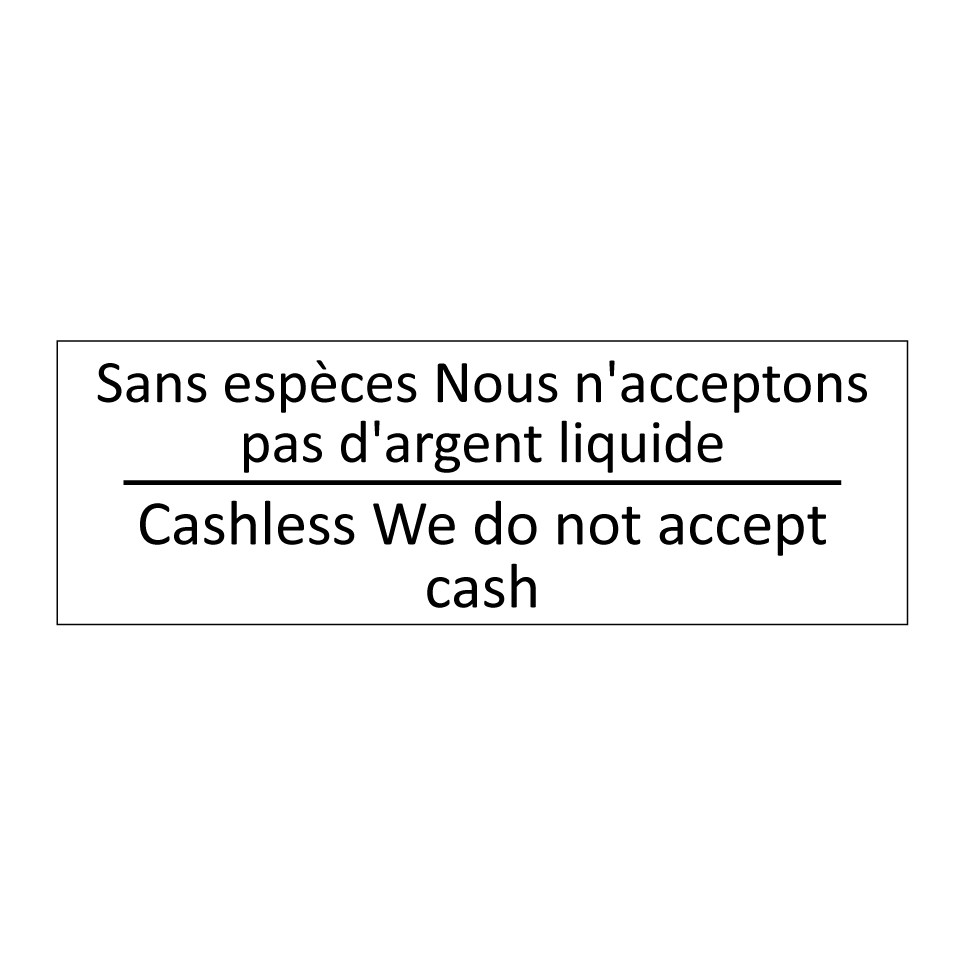 Panneau d'information avec le texte Sans espèces Nous n'acceptons pas d'argent liquide|Cashless We do not accept cash en français et en anglais.