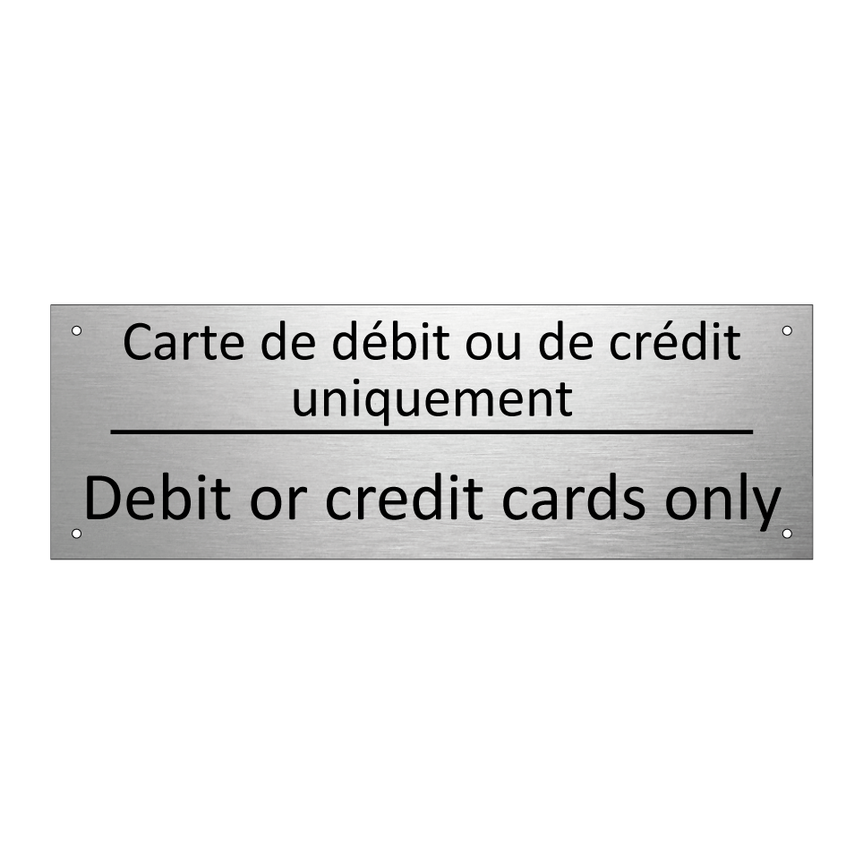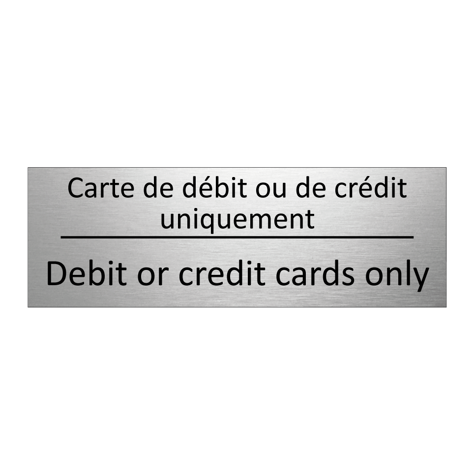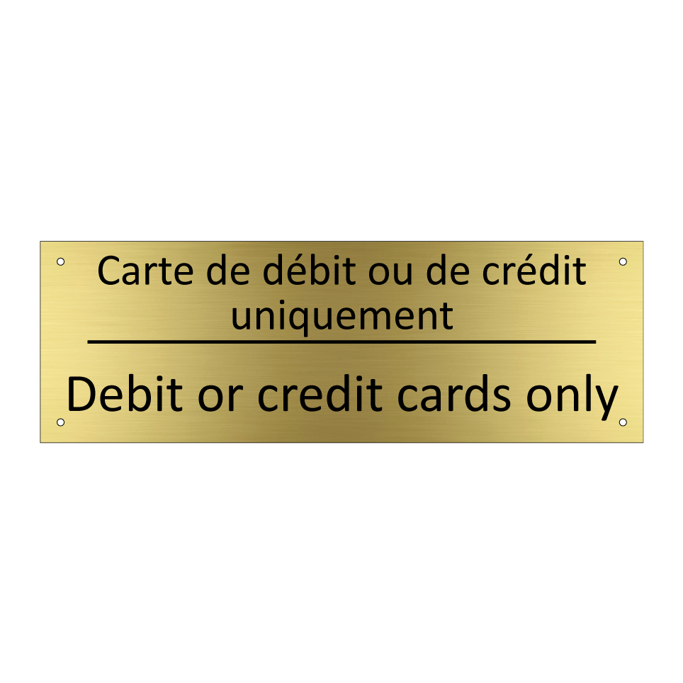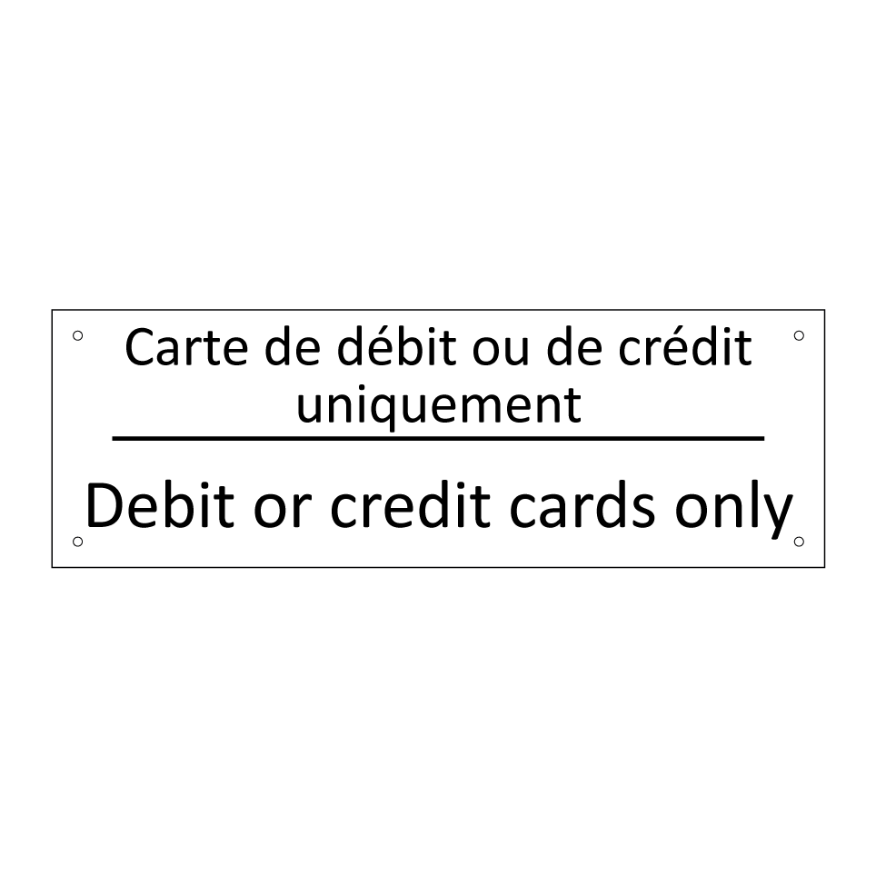 Panneau d'information avec le texte Carte de débit ou de crédit uniquement|Debit or credit cards only en français et en anglais.