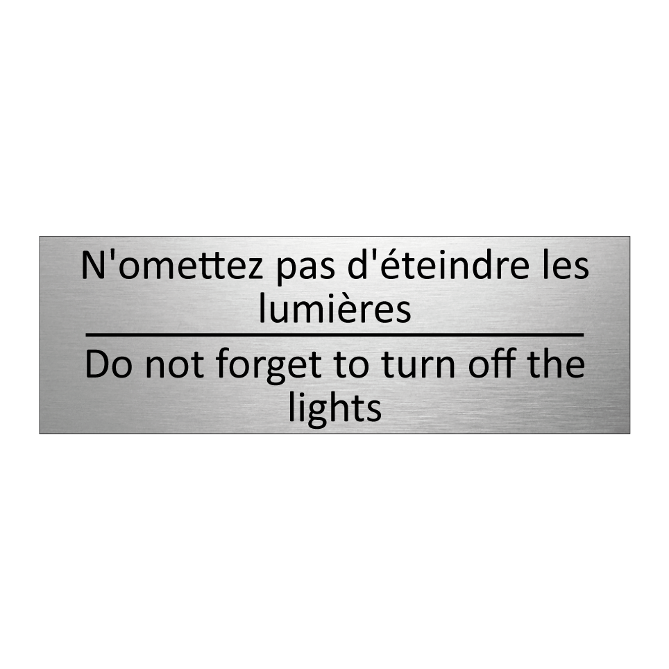 Panneau d'information avec le texte N'omettez pas d'éteindre les lumières|Do not forget to turn off the lights en français et en anglais.