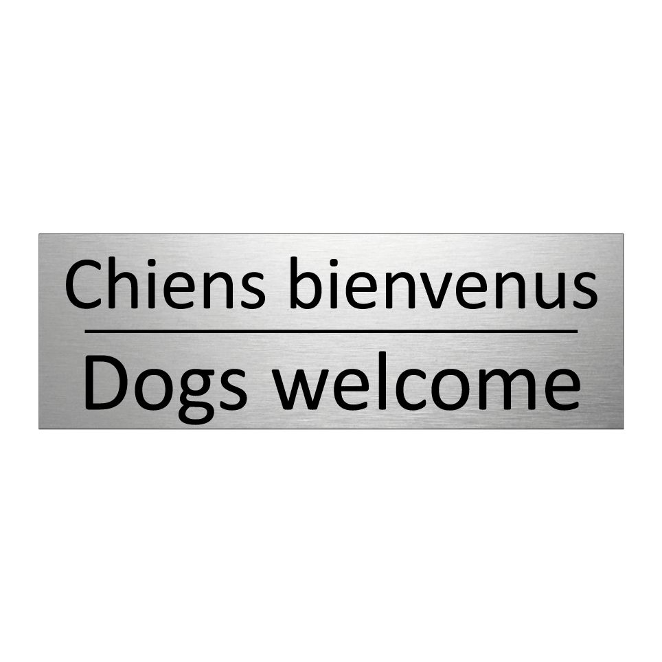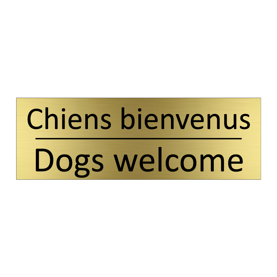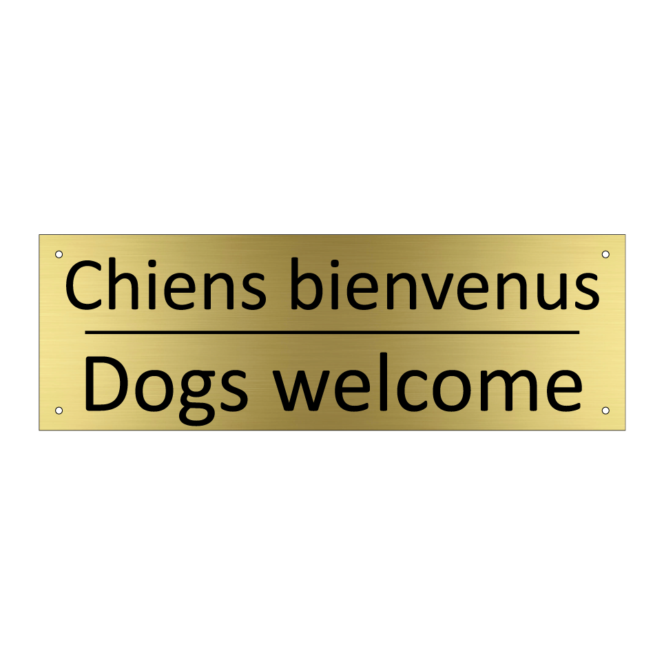 Panneau d'information avec le texte Chiens bienvenus|Dogs welcome en français et en anglais.