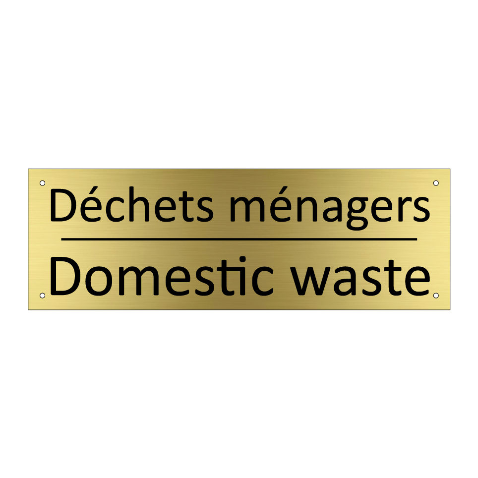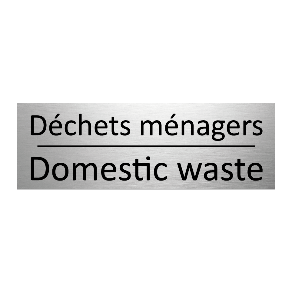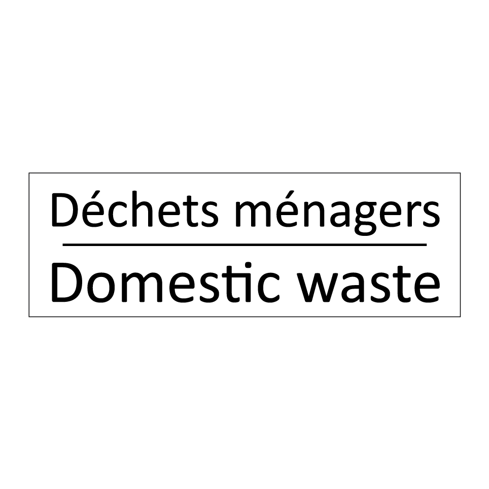 Panneau d'information avec le texte Déchets ménagers|Domestic waste en français et en anglais.