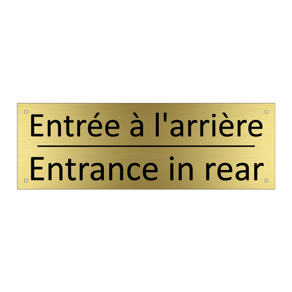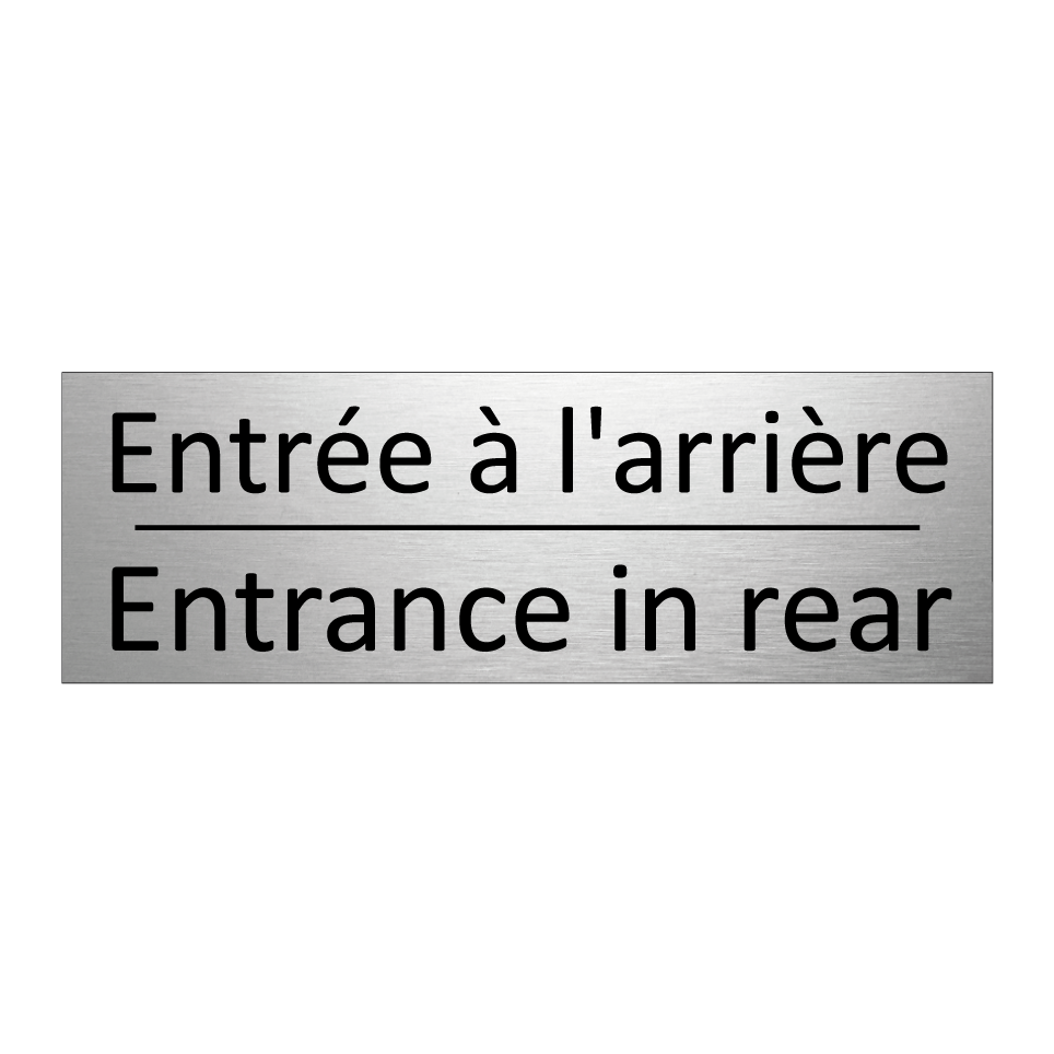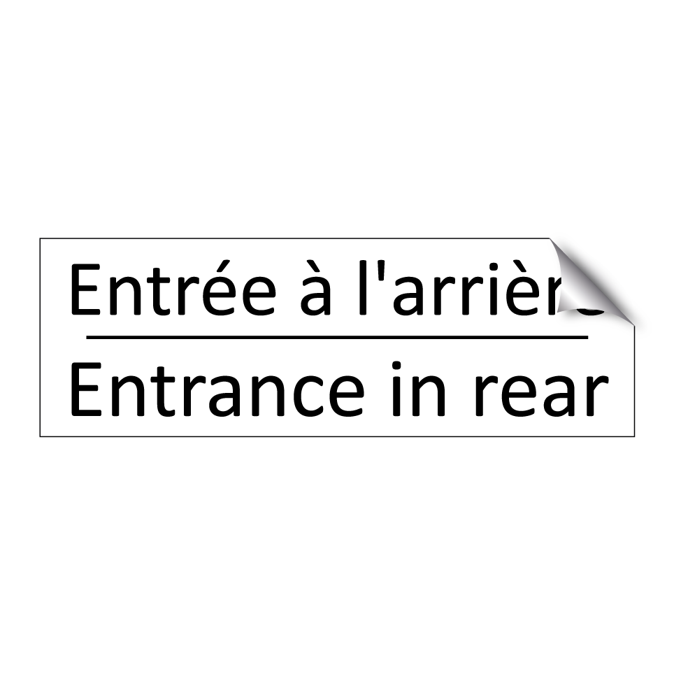 Panneau d'information avec le texte Entrée à l'arrière|Entrance in rear en français et en anglais.