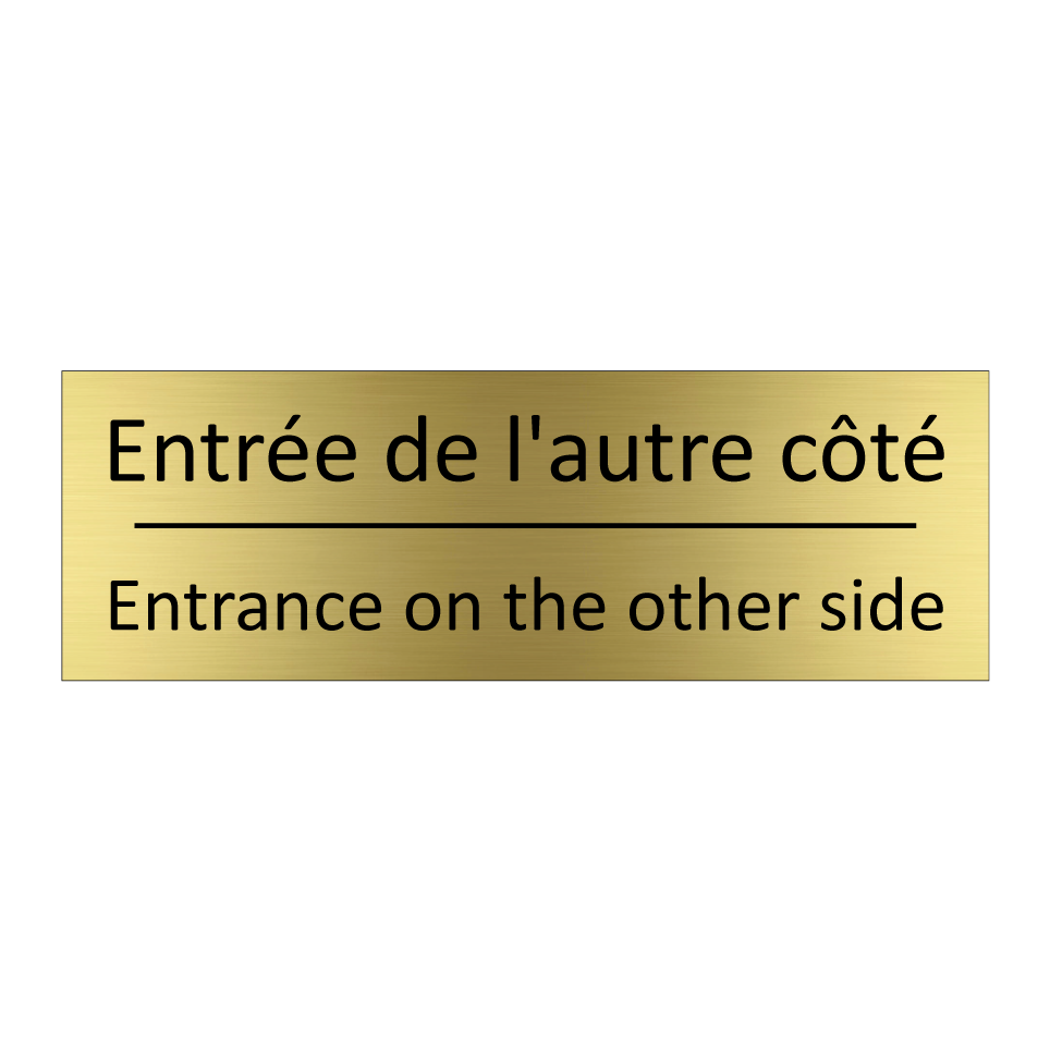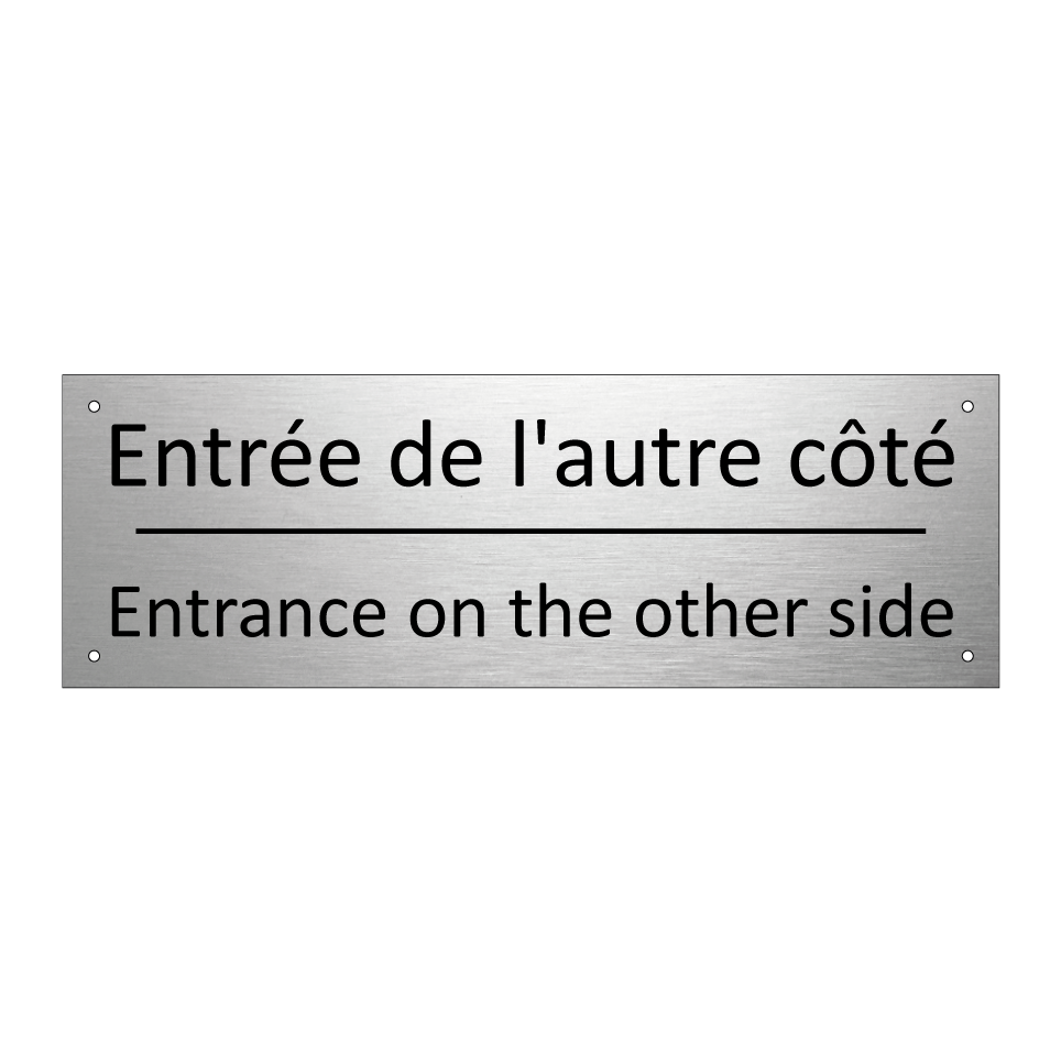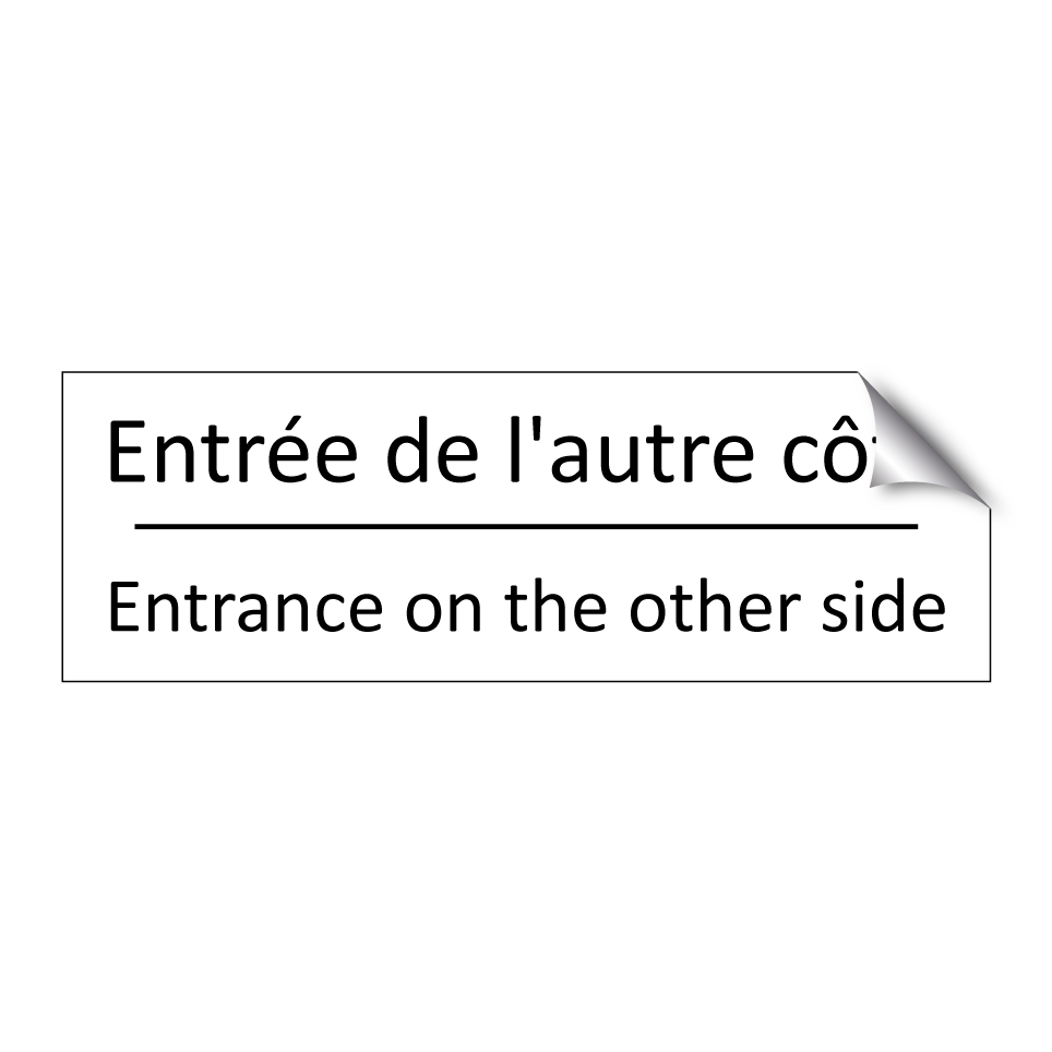 Panneau d'information avec le texte Entrée de l'autre côté|Entrance on the other side en français et en anglais.