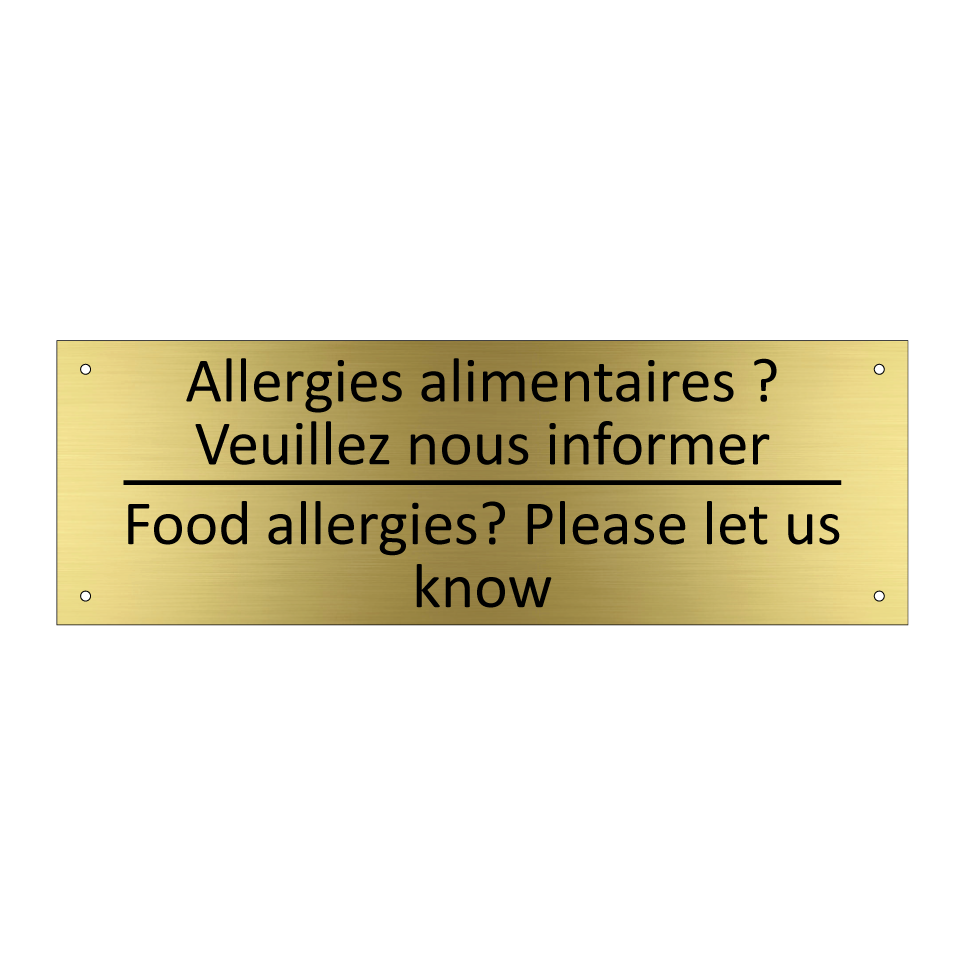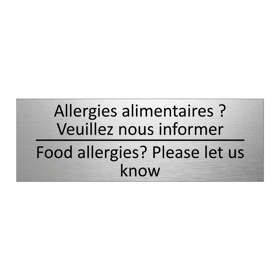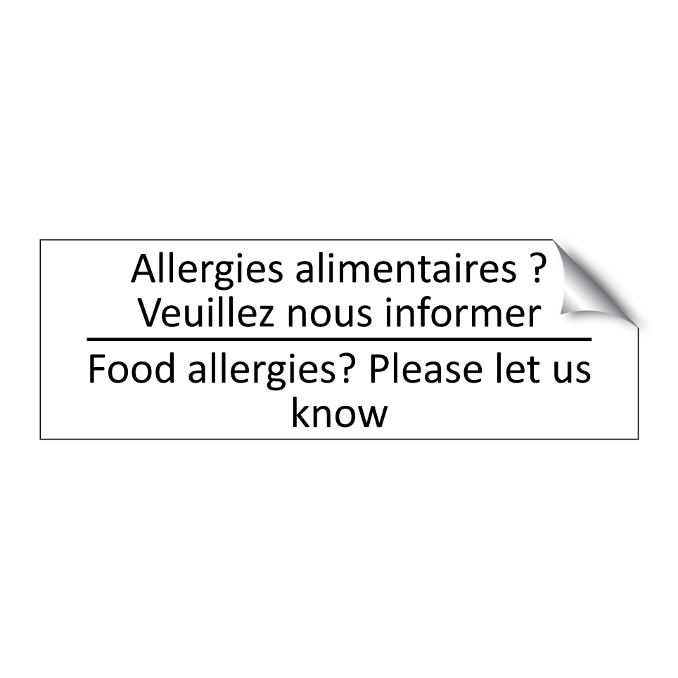 Panneau d'information avec le texte Allergies alimentaires ? Veuillez nous informer|Food allergies? Please let us know en français et en anglais.