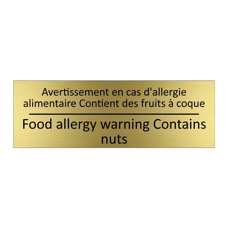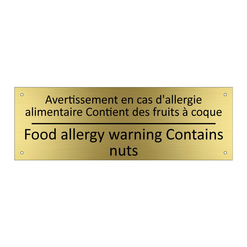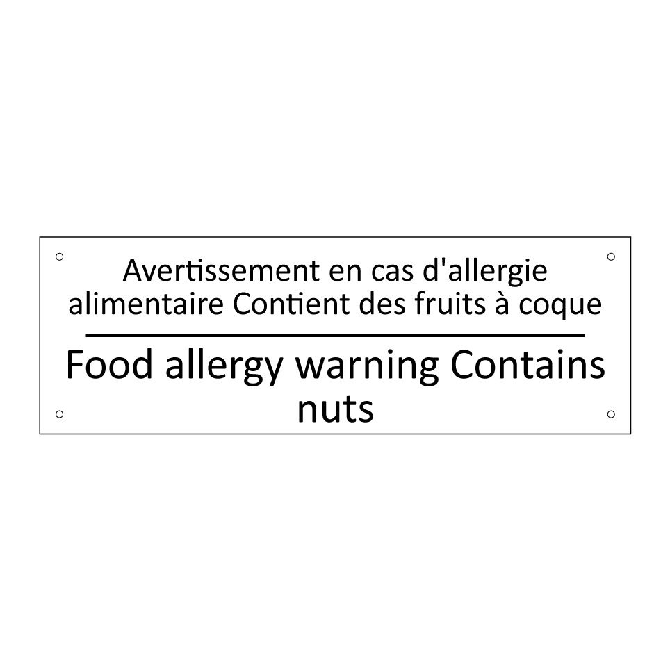 Panneau d'information avec le texte Avertissement en cas d'allergie alimentaire Contient des fruits à coque|Food allergy warning Contains nuts en français et en anglais.